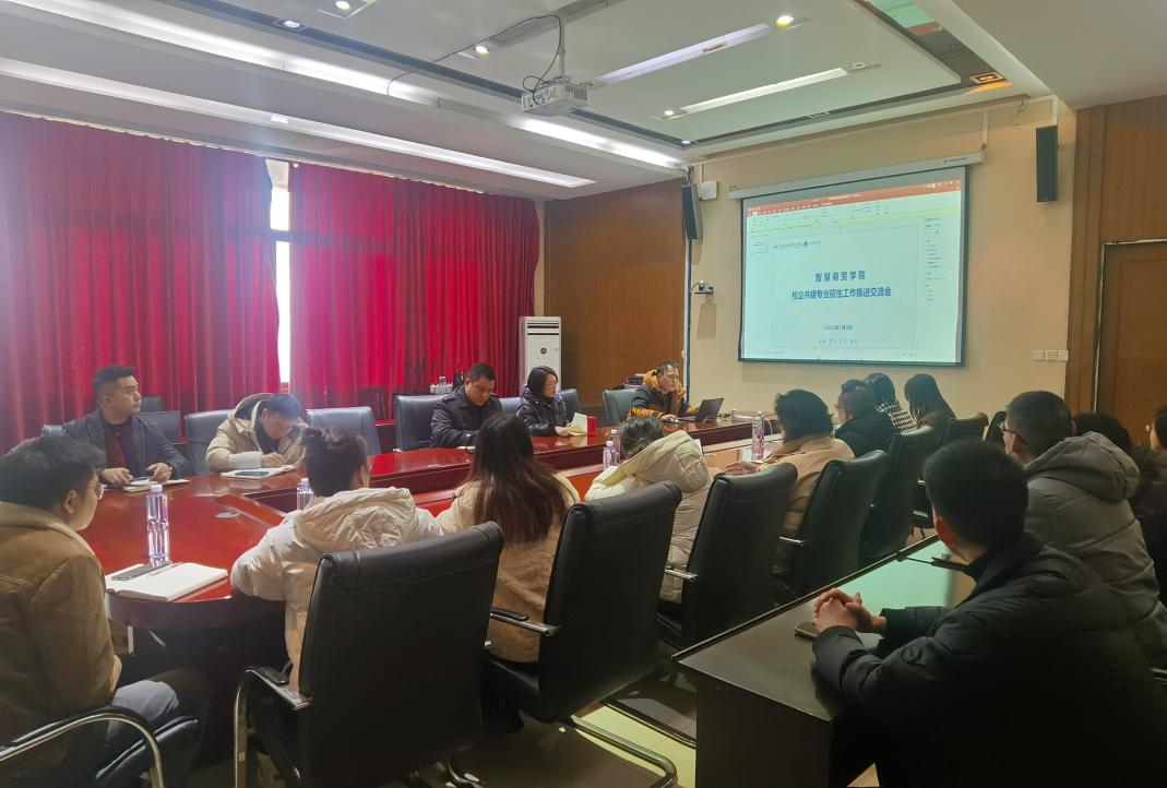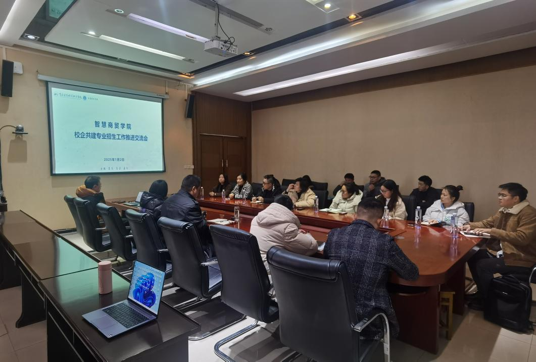 2025年1月2日下午14:00,智慧商贸学院在立德楼5楼会议室召开校企共建专业招生工作推进交流会。学院院长周旖、副院长陈雨、党委书记孙小川、学工办主任彭家正、专任老师和企业代表参加会议。
