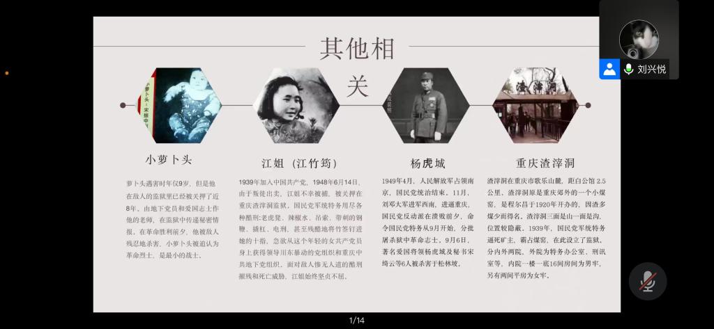 活动主讲人悦给大家讲述了“重庆大屠杀”的背景,在一张张图片后面,隐藏的是屠杀后面残酷的事实11月27日,重庆解放在即,国民党反动派逃跑前,对囚禁在白公馆、渣滓洞等监狱的革命者进行了大规模屠杀,制造了屠杀中共党员和爱国民主人士的重庆“11·27大屠杀。从渣滓洞到白公馆,这些所谓的“看守所”里面发生的事情惨不忍睹,特别是当讲到“江姐”那一段时,所有同学心都揪了一下,一方面是对江姐所遭遇的一切的惋惜,另一方面是对国民党特务的残酷暴行的愤怒!