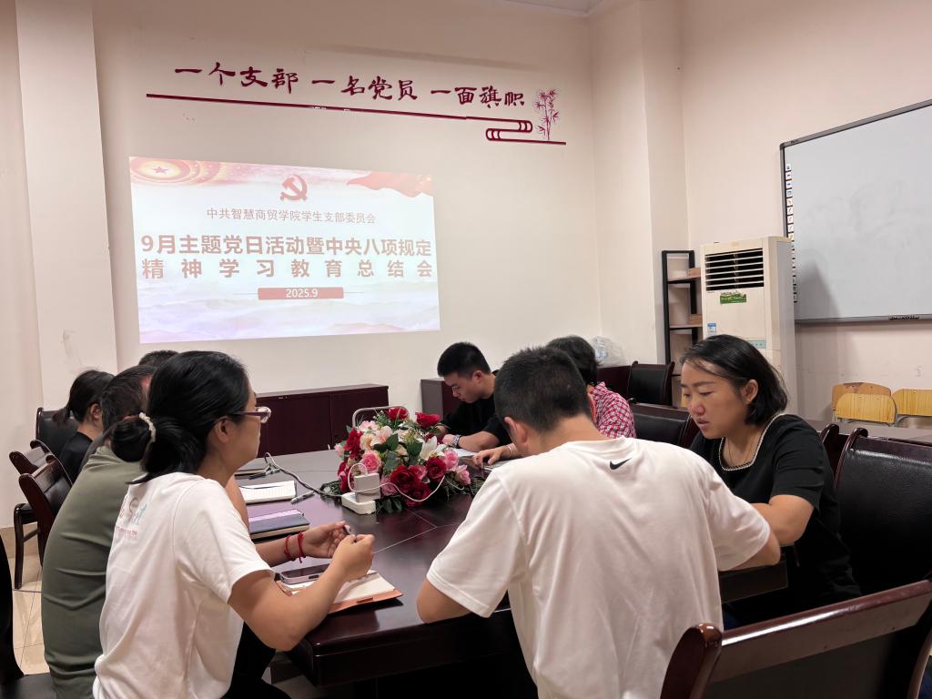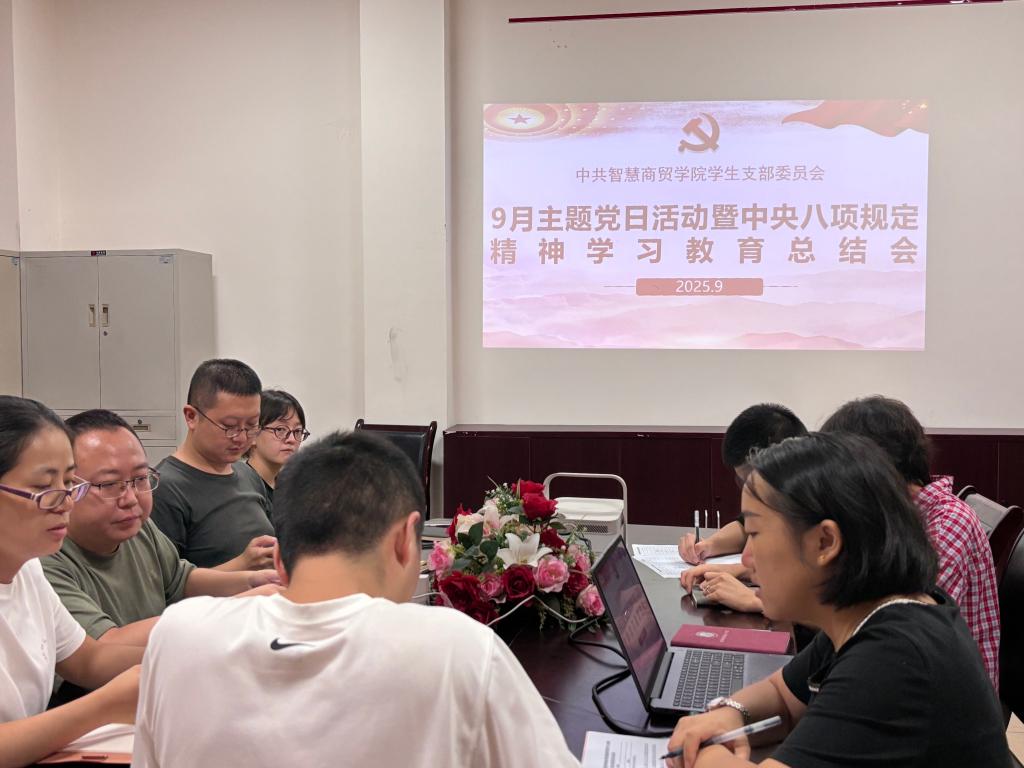 2025年912日,智慧商贸学院学生支部党员同志在学院会议室3412进行了9月主题党日活动。为深入贯彻落实全面从严治党要求,进一步增强党员的纪律意识和规矩意识,专题学习中央八项规定精神并进行深入研讨。本次活动旨在引导全体党员深刻领会八项规定精神实质,自觉弘扬优良作风。