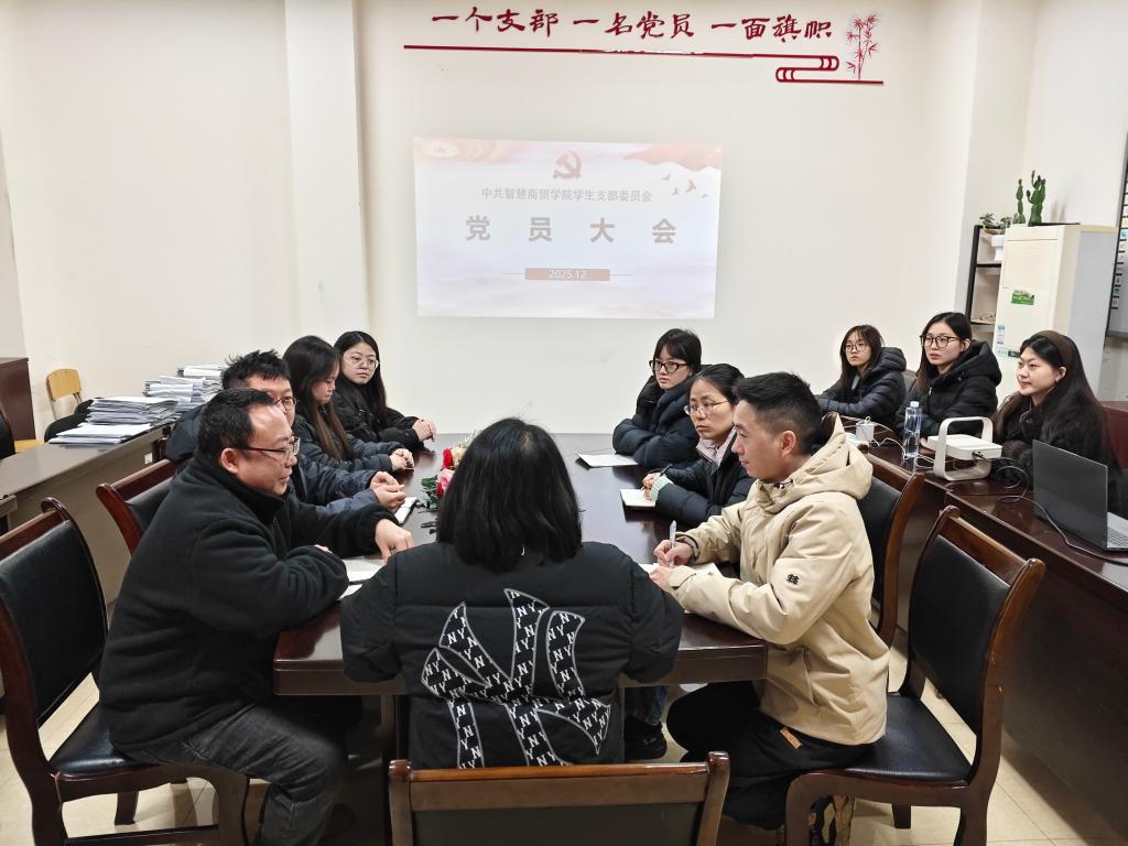 2025年12月5日,智慧商贸学院学生党支部在笃学楼3412会议室组织开展十二月主题党日活动。本次活动紧扣时代脉搏,聚焦发展前沿,通过系统学习党的创新理论、关于发展新质生产力的重要论述、党的自我革命战略思想以及习近平法治思想的最新成果,引导支部全体党员深刻把握国家发展大势,筑牢思想根基,强化责任担当。活动由党支部书记主持,全体学生党员参加。