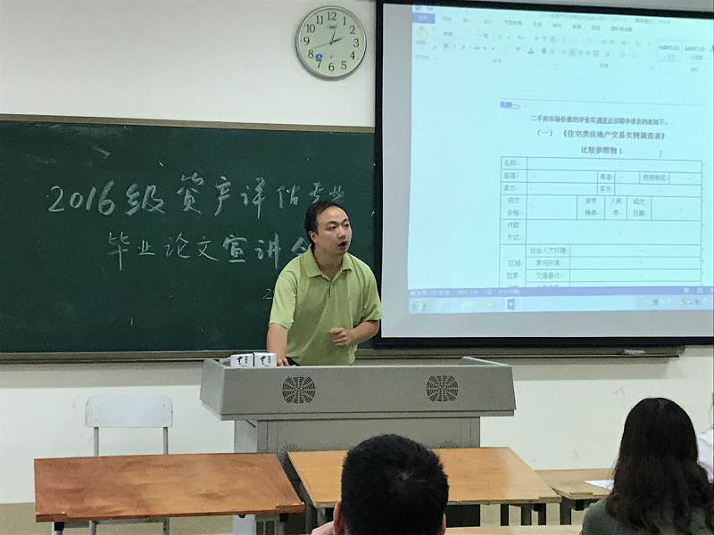 宣讲会上,何一舟老师向16级学生们讲解了如何开展毕业论文任务,本次毕业论文主题围绕住宅类房地产或车产进行调查、分析与评估。何一舟老师展示了毕业论文的写作要求,要求学生们做到不抄袭、不雷同,突出独立性、专业性、鲜明性和完整性。要求学生们在毕业论文老师的指导下,结合毕业顶岗实习,充分沟通,集思广益,完善选题方案,优化毕业课题,顺利完成论文。