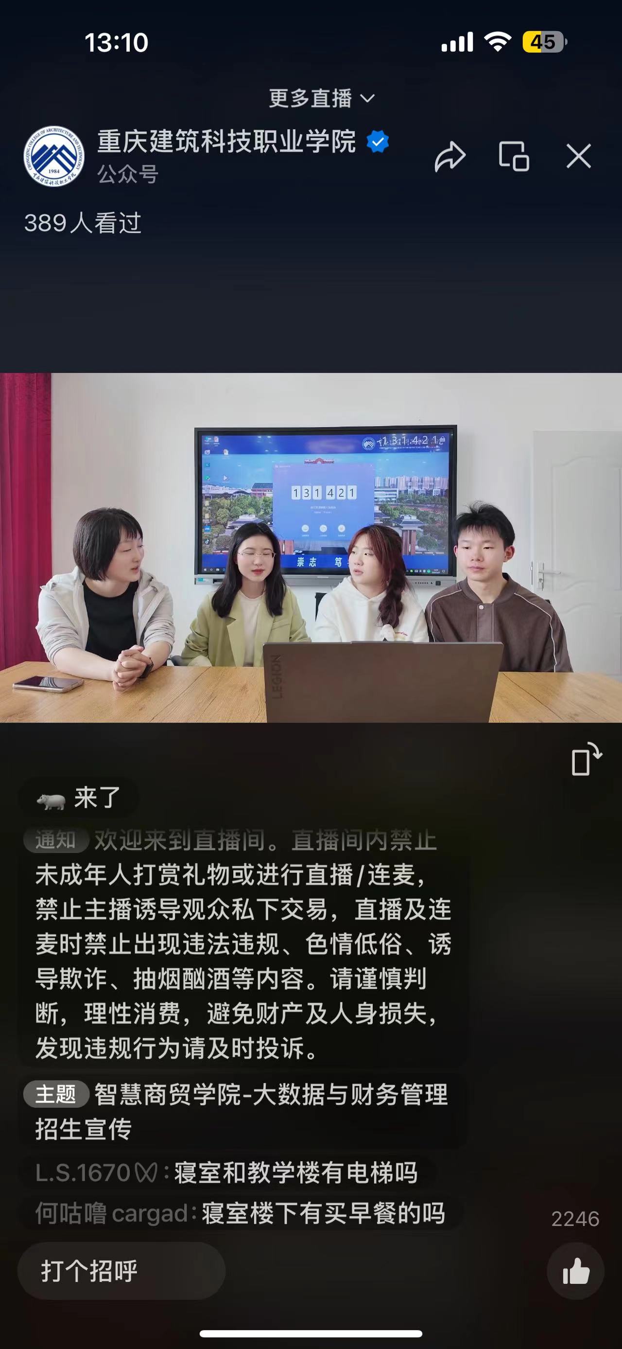 2025年3月27日星期四,大数据与财务管理专业在学校直播基地成功举办了一场主题为“迈向财务管理数字化与智能化”的招生宣传直播活动。此次活动于11:30至13:30进行,由褚志姣、吴娜、王安、李林芝、刘影、鲜颖等六位资深教师主持,吸引了包括刘栋文和饶冲秋在内的众多学生及家长的关注。