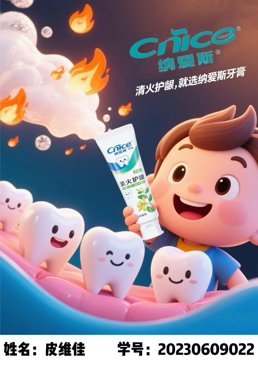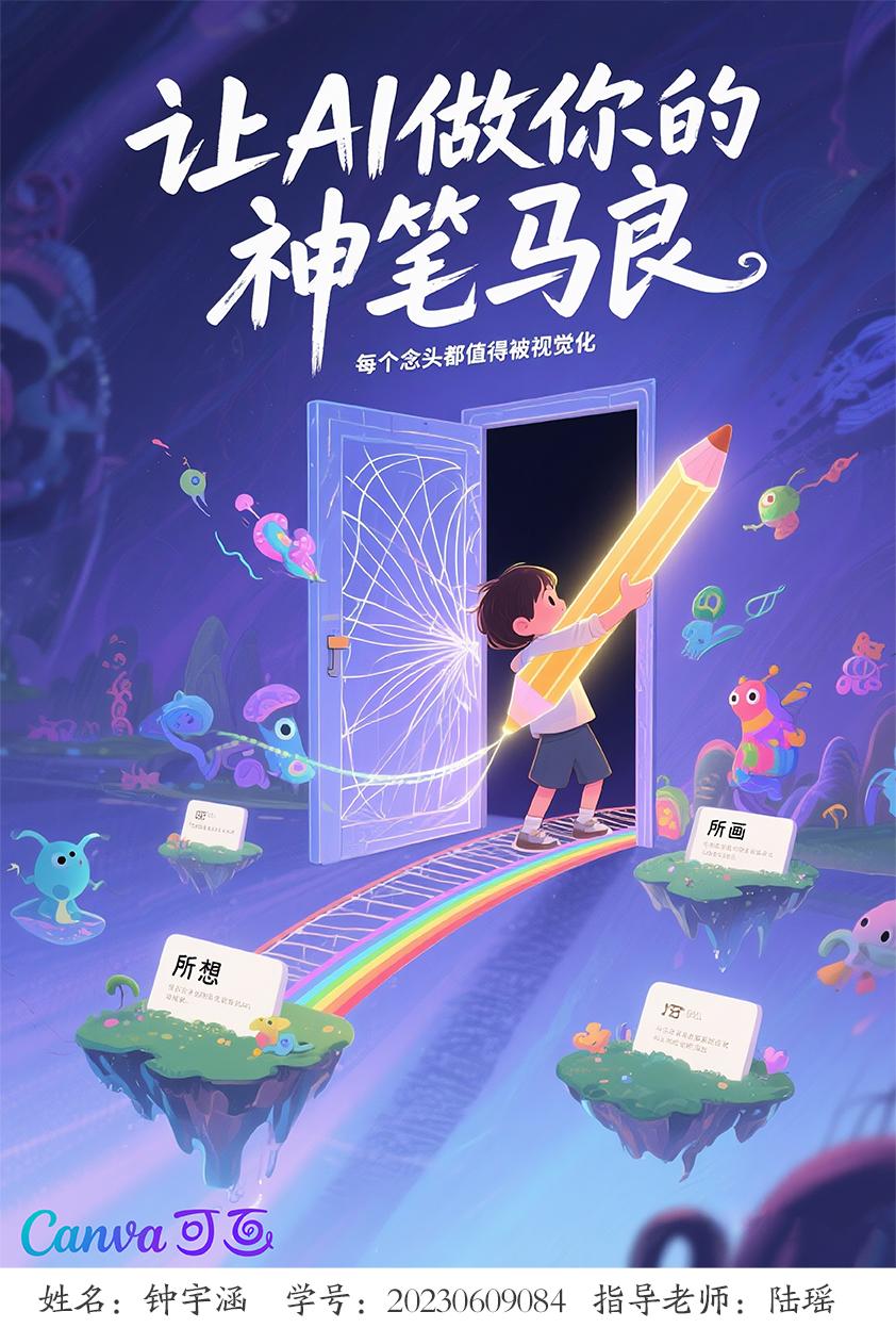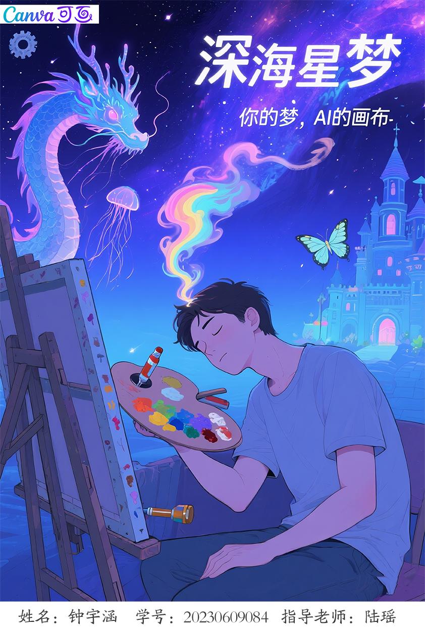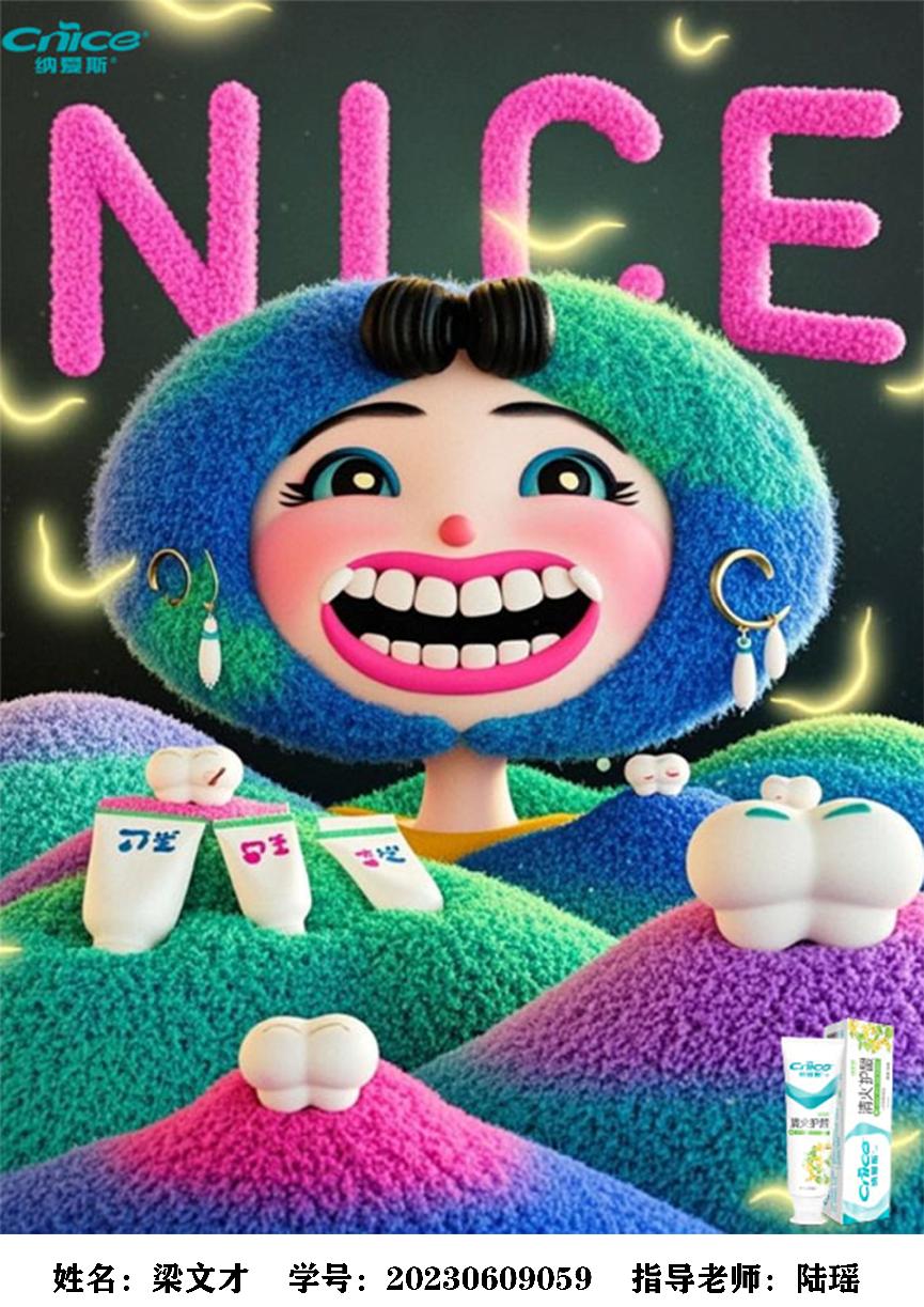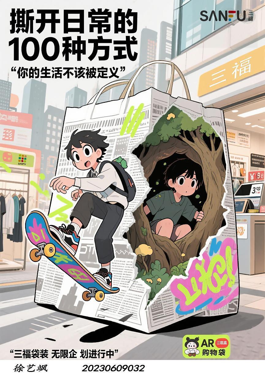 学生作品呈现出丰富的设计风格与创意表达。创作者们分享了学习心得:“之前总觉得设计需要天赋,但AI工具让我发现,只要敢想敢试,每个人都能创造出专业级的作品。”也有学生表示:“通过学习AI绘画,我不再被‘不会画画’束缚,现在能将自己的商业策划用视觉化方式呈现,这对我们专业的营销方案制作帮助极大。”另一位学生坦言:“课程最让我惊喜的是,AI不仅提供技术辅助,更教会我们用设计思维解决问题,这让我对未来的职业发展更有信心。”教师陆瑶评价,学生们通过课程不仅掌握了工具,更形成了“技术+创意”的双向思维模式,作品质量远超预期。