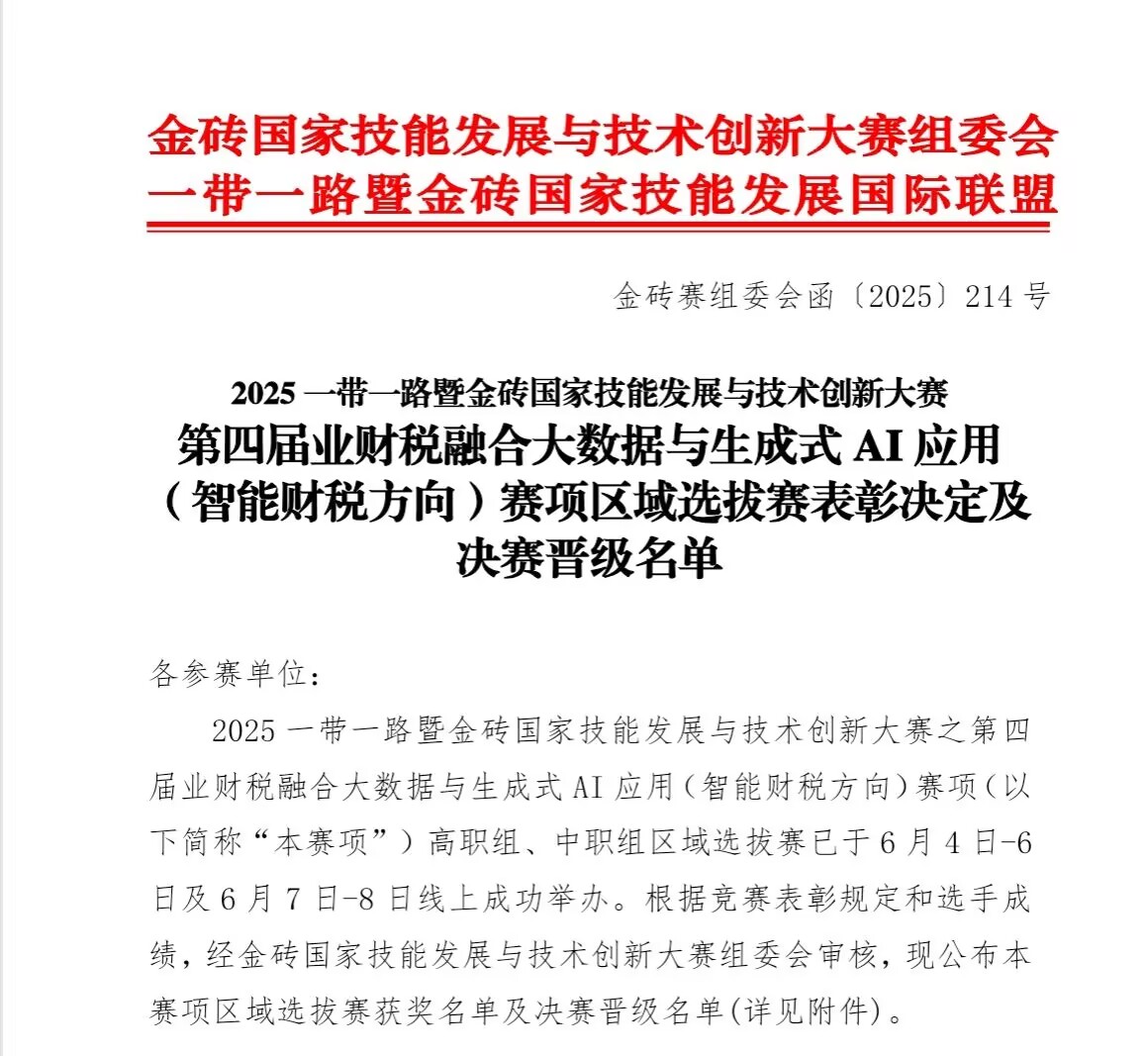 一带一路暨金砖国家技能发展与技术创新大赛第四届业财税融合大数据与生成式AI应用(智能财税方向)赛项作为一项高规格的国际赛事,旨在促进各国在技能发展与技术创新领域的交流与合作,推动全球技术创新的进步与发展。此次大赛吸引了众多国内外高校和专业人才参与,竞争异常激烈。