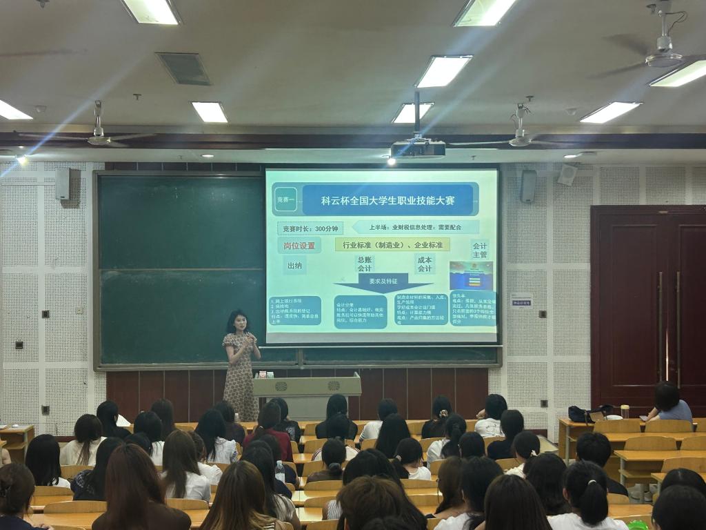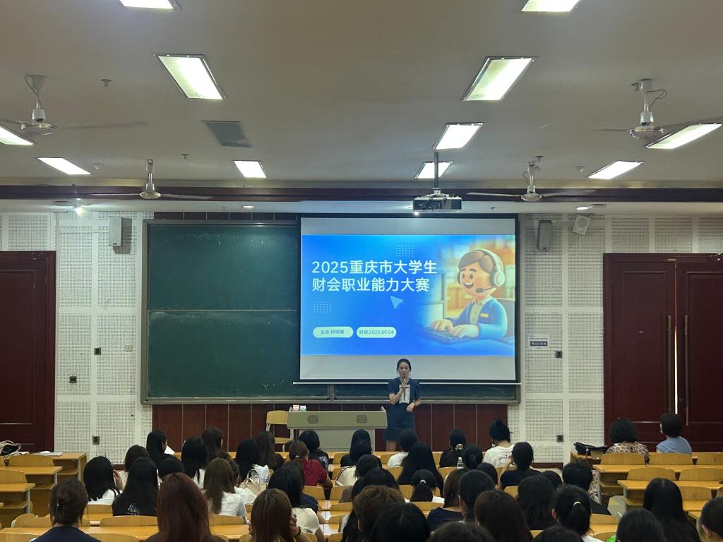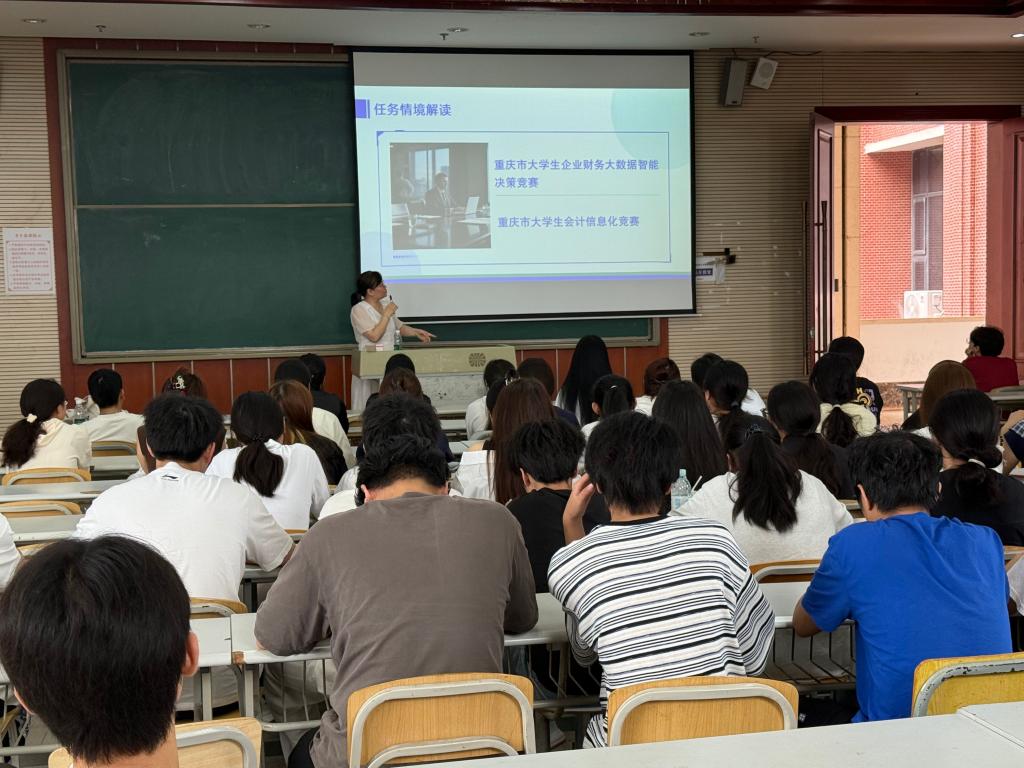 下午活动主要围绕竞赛宣讲和初级会计师考证介绍展开,智慧财务教研室刘影老师向全体新生们致以热烈的欢迎。宣讲会上,张玥、刘影、鲜颖、钟明婧老师立足行业发展新态势,分别从专业竞赛各个赛项深入剖析了数智技术对财会领域的深刻影响。张玥老师指出,随着大数据、人工智能与财务管理的深度融合,行业对“懂数据、精业务、擅决策”的新型人才需求激增。接着介绍了财会职业能力大赛内容,本次竞赛含管理会计技能竞赛、大数据业财处理技能竞赛两个环节。其中,管理会计技能竞赛聚焦企业真实场景,依托管理会计指引框架,通过战略规划、预算编制、成本控制等七大核心任务,锤炼学生运用管理会计工具解决复杂问题的能力;大数据业财处理技能竞赛则要求学生运用Python语言,对某企业多笔业务数据进行全流程处理——从财务核算到报表生成,再到经营分析与可视化,实现“数据驱动决策”的业财融合闭环。刘影、钟明婧、鲜颖老师分别介绍了一带一路暨金砖国家技能发展与技术创新大赛、重庆市职业院校技能大赛、重庆市大学生RPA财务机器人应用与开发竞赛等。钟明婧老师强调,参赛经历将助力学生从“账房先生”转型为“数智化业财先锋”,在真实场景中锤炼核心竞争力。之后,王安老师就初级会计师考证详细的介绍了报名流程及时间,此证的含金量和必要性。最后,活动设置了提问环节,新生们积极举手,就专业学习、校园生活等方面的问题向老师提问。