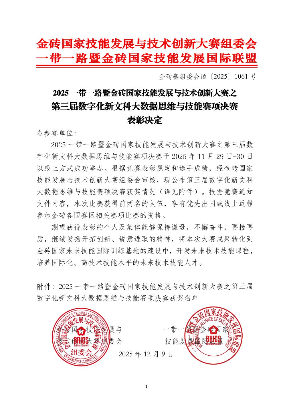 11月29日至30日,2025第九届一带一路暨金砖国家技能发展与技术创新大赛——第三届数字化新文科大数据思维与技能竞赛国内决赛通过线上进行,大赛由金砖国家工商理事会、一带一路暨金砖国家技能发展国际联盟、中国科协一带一路暨金砖国家技能发展与技术创新培训中心主办,中国发明协会、教育部中外人文交流中心联合主办。本届赛事汇聚了来自全国共计1000多支赛队参赛,涵盖教师组、本科组及高职组,经过预赛激烈角逐,共有387支队伍进入决赛,其中教师组有40支队伍进入全国总决赛,参加了线上答辩。最终,Kaiyun官方网站登录入口智慧商贸学院教师任媛、邓艳芳获得教师组三等奖。这也是Kaiyun官方网站登录入口两名教师在该赛项的第三次获奖,连续三届参赛,共获得二等奖1项和三等奖2项。