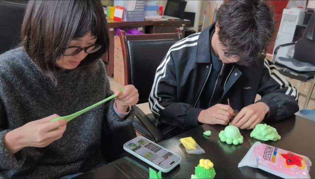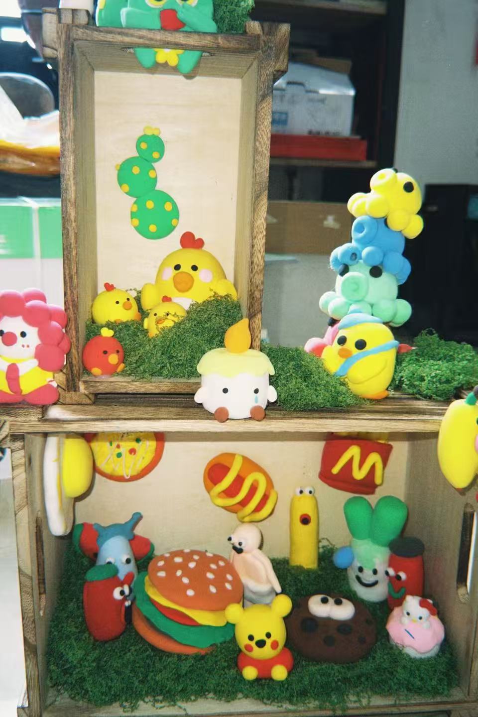 除了田间劳作,本次活动还特别融入了艺术创作元素,打造“田园+美育”的复合型劳动实践模式。在刘清秀老师和周庆莲老师的带领下的辅导员团队,和学生们利用彩泥、黏土等材料,发挥想象力与创造力,手工制作了一系列富有童趣与创意的田间装饰物。这些作品包括憨态可掬的小鸡一家、色彩斑斓的汉堡包、萌趣十足的草莓小熊、可爱的绿色仙人掌等,造型生动,色彩明快,充满生活气息与艺术美感。