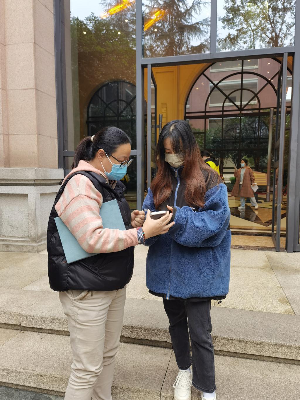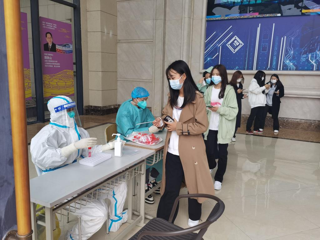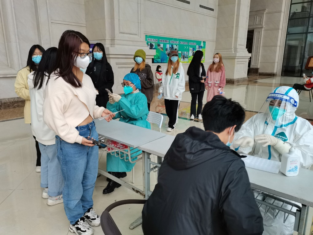 教学楼大厅,他们身着防护服,组织学生有序进行核酸检测,协助进行核酸扫码、信息登记,维护队伍秩序,直到最后一名学生完成检测;