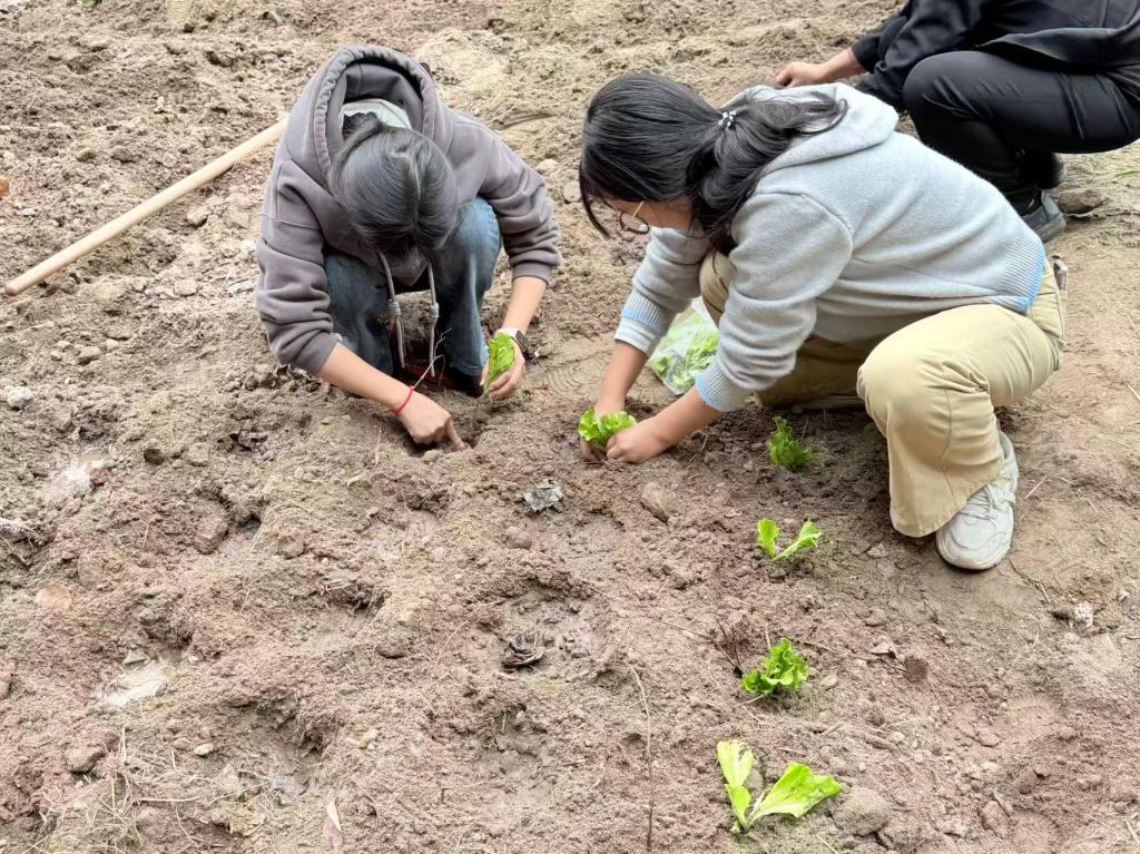 活动伊始,师生们带着锄头、耙子等工具迅速投入劳作。大家分工协作,仔细拔除田间杂草,认真翻松板结土壤,为作物生长营造疏松透气的环境。随后,按照科学配比施肥,小心移栽生菜、莴苣幼苗,再用水盆逐株浇灌,让清水浸润每一寸土地,用细致呵护为作物生长筑牢基础。