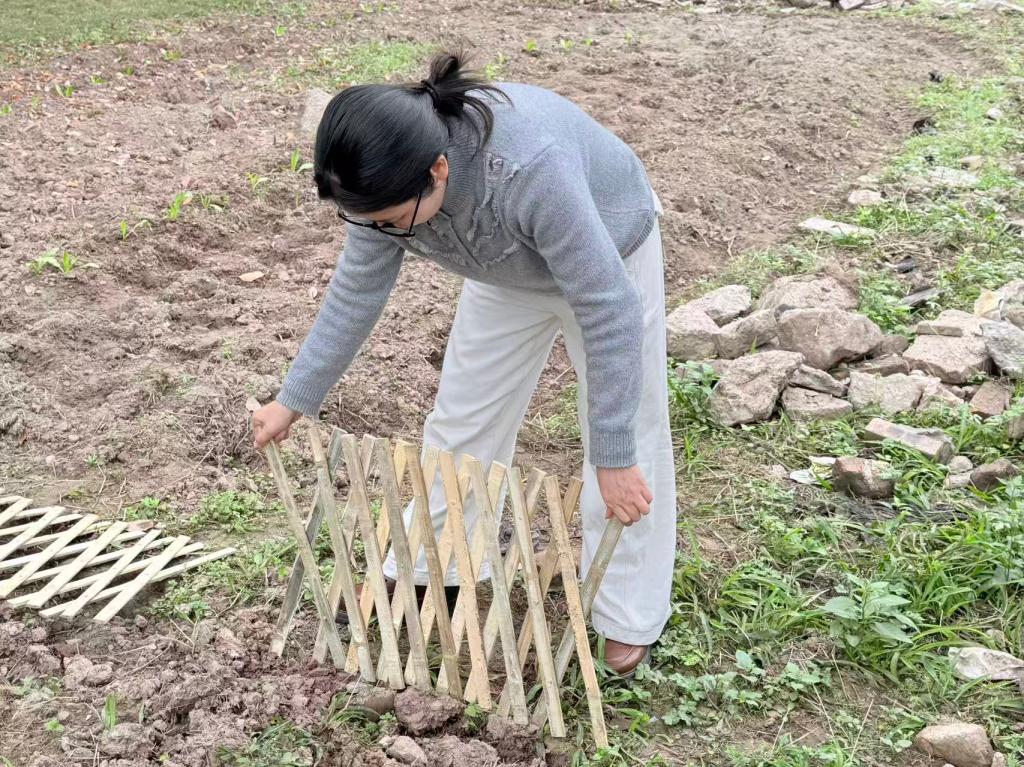 完成田间养护后,同学们开启新苗种植关键环节。从挖坑、放苗到覆土、压实,每一步都一丝不苟,确保幼苗顺利扎根。种植任务完成后,大家又主动搭建竹篱笆,用错落的木条勾勒出整齐的菜园边界,既为作物筑牢“防护屏障”,也为朴素的菜地增添了清新的田园意趣。