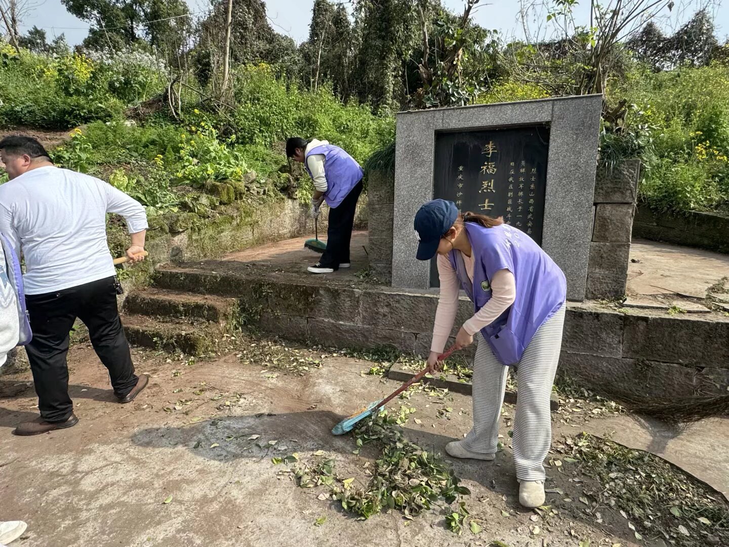 到达现场后,志愿者们迅速分工。有的仔细擦拭墓碑,清除碑面灰尘与污渍,让李福烈士永垂不朽的金色字迹更加清晰醒目;有的手持扫帚,认真清理墓区周边的杂草、落叶和垃圾;还有的整理周边环境,分类收纳散落杂物,确保纪念场所整洁肃穆。清洁过程中,大家神情肃穆、动作轻柔,每一次擦拭与清扫,都饱含着对革命先烈的深切缅怀与崇高敬意。