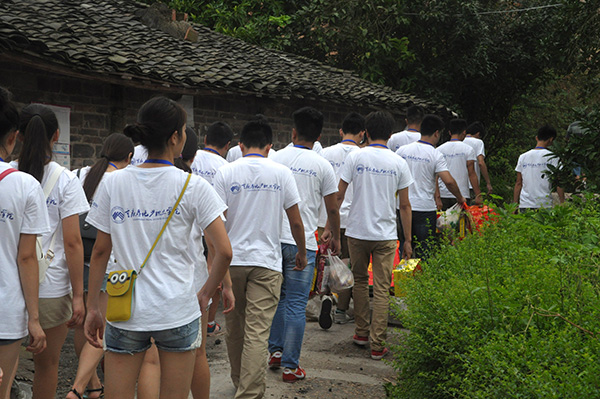 中午,彭家正老师在与龙泉村村支书深入探讨后,最终决定了十几户人家作为慰问对象。在彭家正老师召开工作部署会议,具体安排了每个人的工作任务后,2点40分,在龙泉村村支书的带领下,志愿者拿上慰问品,踏上了慰问之路。志愿者顶着40度的高温在田间小道、竹林中行走着,高温并没有影响到他们的积极性,他们始终以最好的状态、最美的微笑慰问每一户家庭。