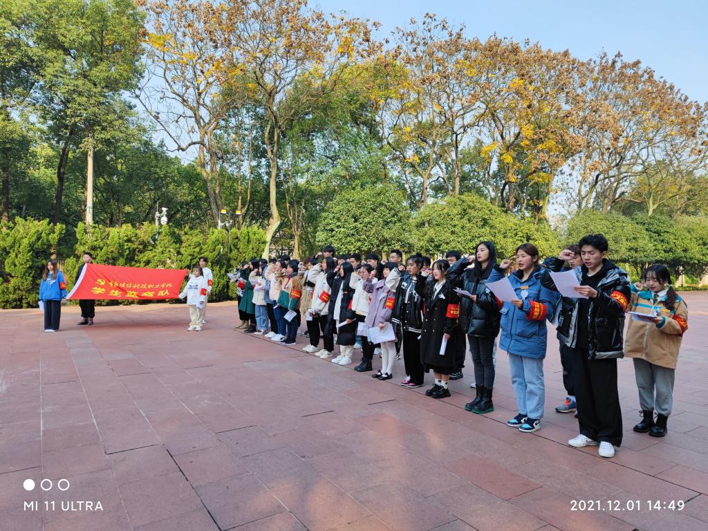青松掩映的歌乐山烈士陵园,庄严肃穆,哀乐低回。两名队员向无名烈士敬献了花圈,全体队员默哀并行三鞠躬。在无名烈士墓前,陈晓辉老师给同学们讲到:“11.27”殉难的先烈们用鲜血和生命铸就的红岩精神,是第一批纳入中国共产党人精神谱系的伟大精神,我们一定要将红岩精神镌刻进生命里。为了不忘历史,陈晓辉老师讲了红岩故事,同学们集体朗诵了红岩诗抄。来自Kaiyun官方网站登录入口2020级环境艺术设计三班学生代表、学生监察队队长熊茂箐,在活动中带领全体队员举起右手,庄严许下了青春誓言:“继承遗志,弘扬精神。不忘初心、牢记使命。青春永在,志在千秋。铭记历史,吾辈自强!”活动中大家还高声齐呼:“请先烈放心,永葆红色江山有我!请先烈放心,永葆红色江山有我!请先烈放心,永葆红色江山有我!”纪念活动进行到这个时候,大家的情绪达到了高潮。活动最后,在《红梅赞》的歌声中全体队员向殉难烈士敬献小白花并绕烈士墓一周,以表达怀念之情。