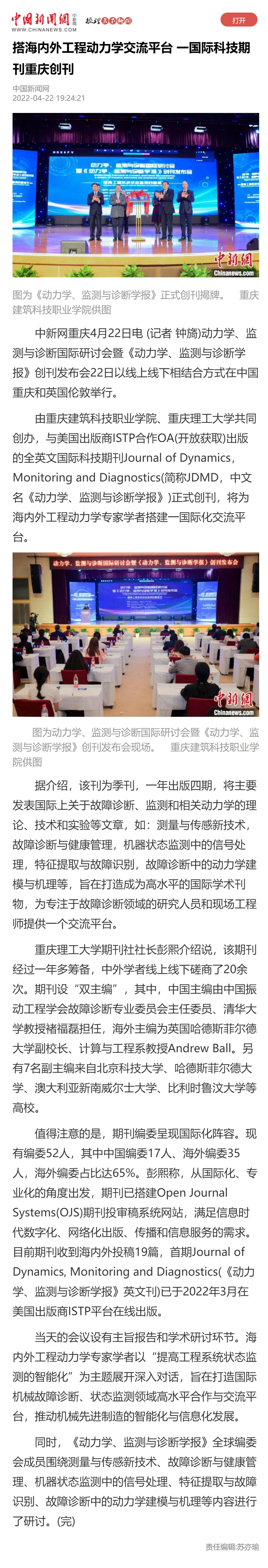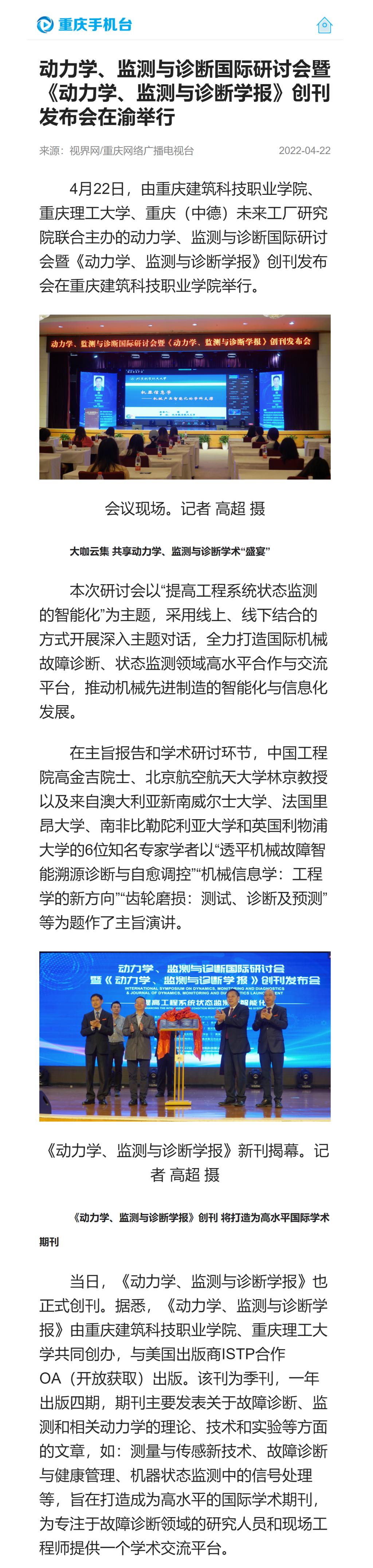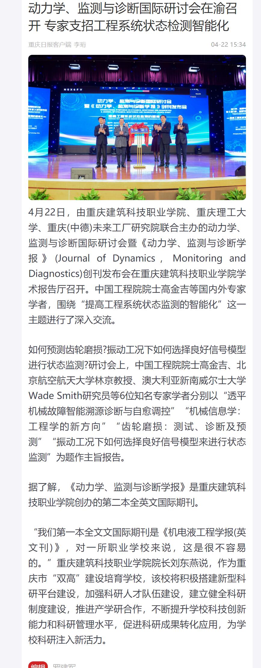 4月22日,由Kaiyun官方网站登录入口、重庆理工大学、重庆(中德)未来工厂研究院联合主办的动力学、监测与诊断国际研讨会暨《动力学、监测与诊断学报》(Journal of Dynamics,Monitoring and Diagnostics)创刊发布会在Kaiyun官方网站登录入口学术报告厅圆满落幕。