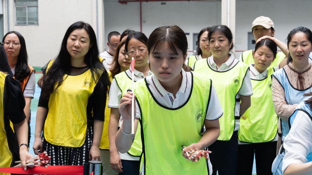本次趣味运动会项目设置充分体现了“趣味”的特色,将趣味游戏与体育锻炼相结合,包含了“旋风跑”“公鸡下蛋”“多向拔河”和“投壶”四项比赛项目。运动会开始,11个工会小组举着队牌穿着整齐的服装来到操场上积极参与。在比赛过程中,大家充分发扬了不怕困难、奋勇争先的精神,既赛出了个人的风采,也赛出了集体的凝聚力。课堂上温文尔雅的老师们,到了运动场上变得活力四射,加油声、欢笑声、热烈的掌声响彻整个校园,每位教职工的脸上都洋溢着灿烂的笑容。