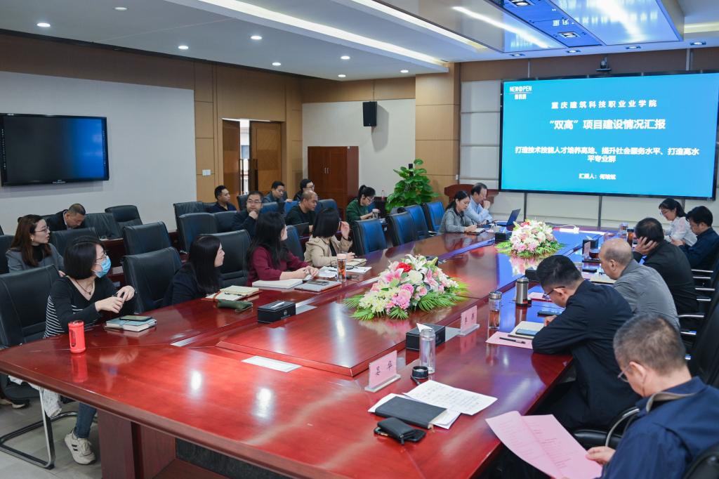 何培斌副校长汇报了“打造技术技能人才培养高地”、“提升社会服务水平”、“打造高水平专业群”三个板块9个专题。分别从“双高任务完成情况”、“标志性成果完成情况”、“标志性成果未完成情况”、“存在的困难及下一步计划”等4各方面进行详细总结。