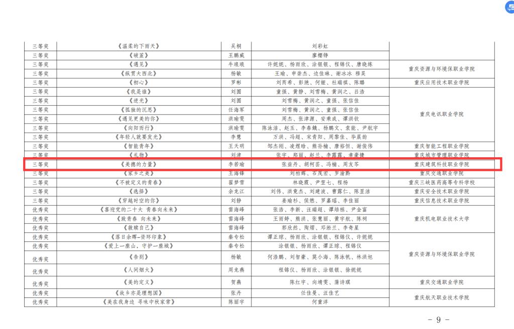 据了解,大赛由重庆市教育委员会指导,重庆市职业教育学会、重庆市文化和旅游研究会主办。本届大赛全市共有45所中、高职院校参赛,共计收到有效参赛作品213个,网络投票期间视频点击量达250万余次,收到有效投票175万余票。