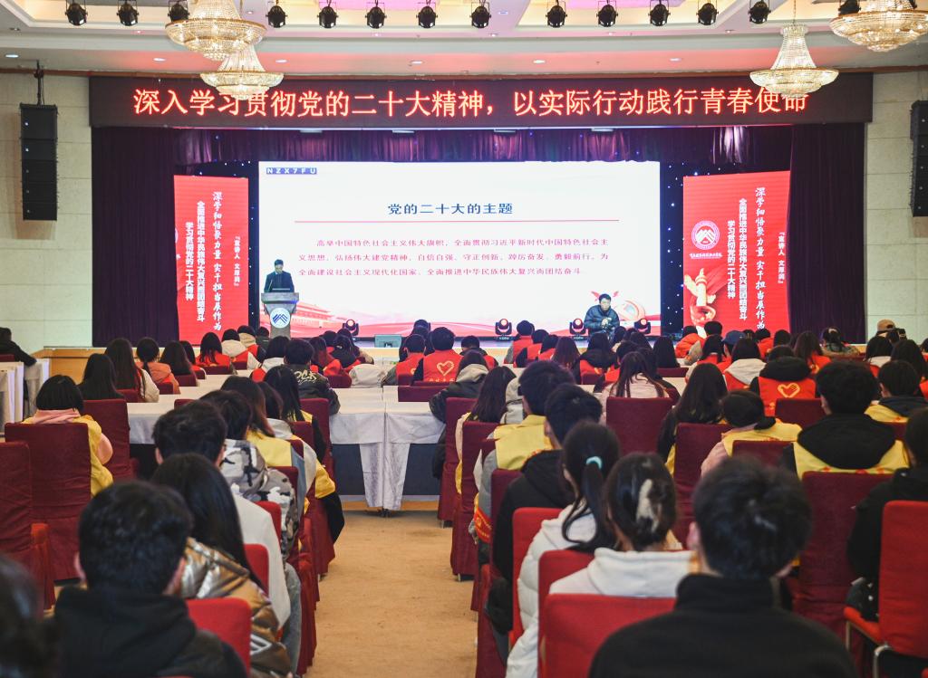 文厚润指出,党的二十大是在全党全国各族人民迈上全面建设社会主义现代化国家新征程、向第二个百年奋斗目标进军的关键时刻召开的一次十分重要的大会,是一次高举旗帜、凝聚力量、团结奋进的大会。党的二十大是向着第二个百年奋斗目标迈进的宣言书和动员令。党的二十大回顾总结了过去五年的工作和新时代十年的伟大变革,阐述了开辟马克思主义中国化时代化新境界、中国式现代化的中国特色和本质要求等重大问题,对全面建设社会主义现代化国家、全面推进中华民族伟大复兴进行了战略谋划,对统筹推进“五位一体”总体布局、协调推进“四个全面”战略布局作出了全面部署。全校师生要上下一心,齐心协力,将学习成效转化为推动工作的强大力量,立足本职,有序推进各项重点工作,推动学校高质量发展。文厚润从学校、干部、教师、辅导员、学生等层面,引导鼓励大家珍惜时光,珍惜时代赋予的机遇,勇担历史使命、做有为青年,为全面建设社会主义现代化国家和实现中华民族伟大复兴的中国梦做出新的更大贡献。