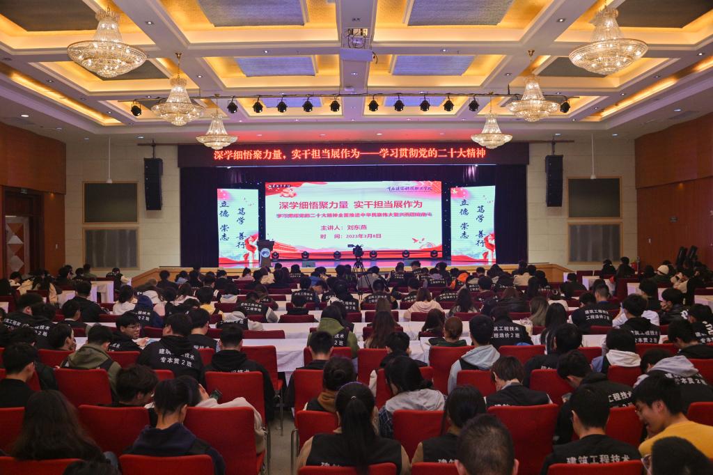 3月8日下午,学校校长刘东燕在学校学术报告厅以“深学细悟聚力量、实干担当展作为,学习贯彻党的二十大精神,全面推进中华民族伟大复兴”为题开展专题宣讲会,全体党支部书记、辅导员、入党积极分子、学生骨干代表近300人聆听。
