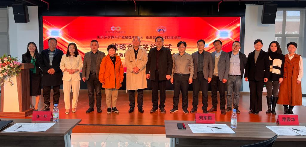 仪式在重庆乡村振兴产业赋能中心举行。学校校长刘东燕、副校长周俊华、房地产商学院院长彭汝伦、产业办公室副主任湛杨、环境艺术学院院长助理张红琼,重庆乡村振兴服务协会副会长马均,重庆乡村振兴产业赋能中心主任任一行,重庆市江北区商务委二级调研员唐燕,重庆新隆合农业科技有限公司总经理李俊等领导出席签约授牌仪式。