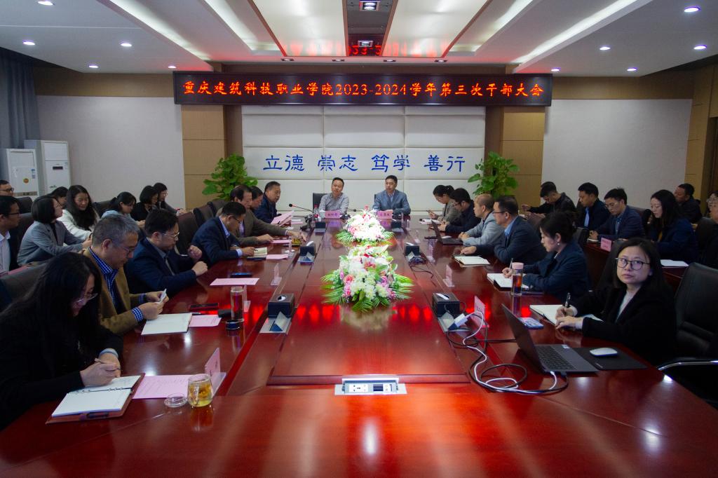 11月10日,学校在立德楼六楼会议室召开2023-2024学年第三次干部大会暨目标责任书签订仪式。新鸥鹏集团董事长、学校理事长杜积西,校长刘东燕、党委书记何光明,全体中层及以上干部参加会议。