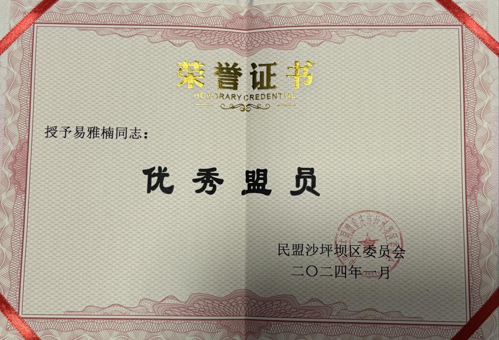 3月29日,在民盟沙坪坝区委会七届10次全委(扩大)会议上,Kaiyun官方网站登录入口民盟支部获民盟沙坪坝委员会授予2022-2023年度“先进集体”荣誉称号,支部主委曾易成、盟员易雅楠获评2022-2023年度“优秀盟员”,支部主委曾易成荣获2023年度“盟务工作先进个人”荣誉称号。