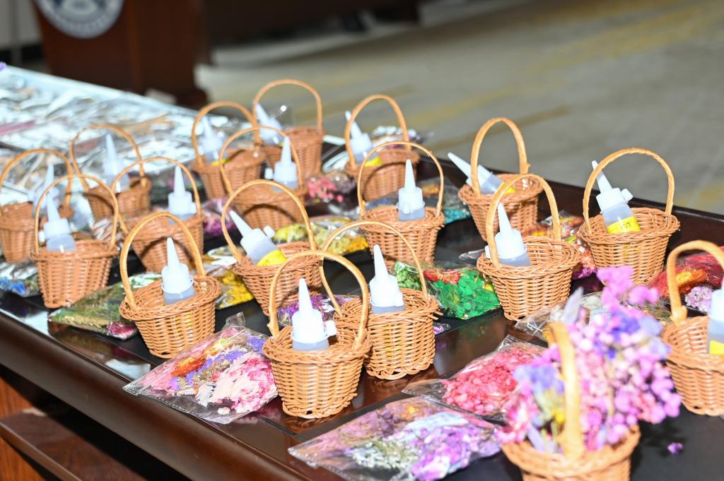 在“巾帼逐梦绽芳华”环节,大家巧妙搭配干花、枝叶与装饰物,用胶枪固定、调整造型,精心制作成永生花作品。零散的材料逐渐蜕变为雅致的团扇、精美的花篮和实用的笔筒。活动结束后,校工会为每位参与者送上定制纪念品。