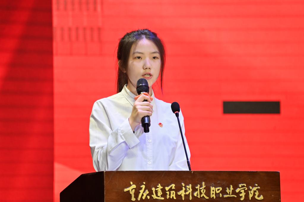 表彰代表、2023级工商企业管理一班陈佳同学上台发言,分享自己的奋斗故事与成长心得,鼓励同学们积极进取、践行五四精神。
