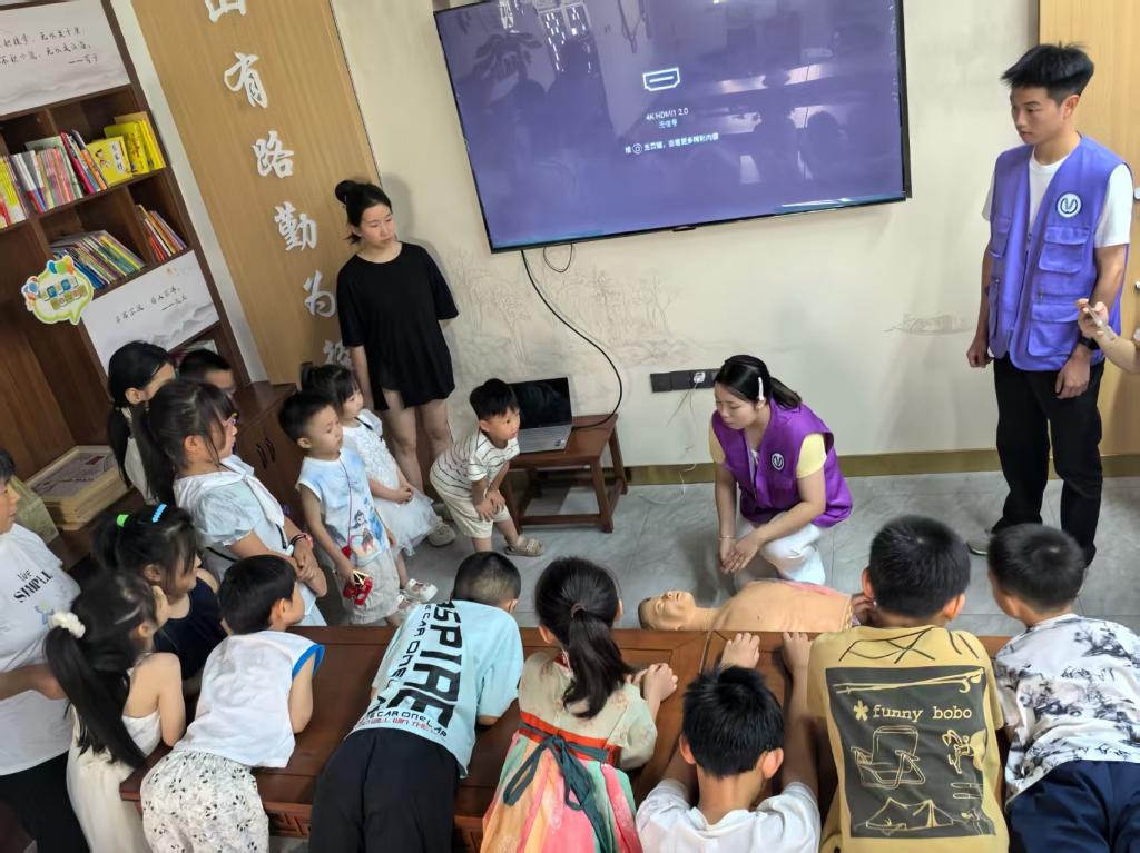 针对暑期儿童安全隐患,团队志愿者重点开展防溺水专题教学。通过情景模拟、案例讲解等方式,向小朋友们普及“六不准”防溺水知识,并现场演示心肺复苏操作流程,手把手指导孩子们掌握胸外按压、人工呼吸等关键步骤,强化“珍爱生命”的安全意识。同时,志愿者们以互动绘本的形式,为孩子们上了一堂生动的安全课,帮助他们建立自我保护意识。
