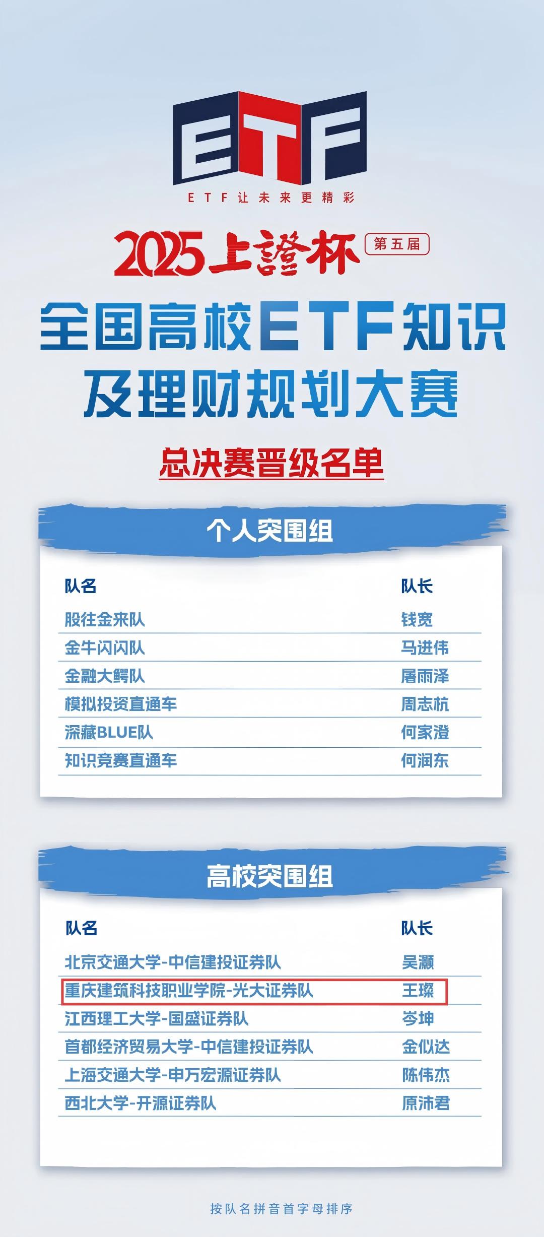 2025上证杯全国高校ETF知识及理财规划大赛自4月份启动以来,以其高规格、广影响的投教赛事定位吸引了海内外3000多所学校的超8万名学生踊跃参与,赛制分为预选赛、半决赛和总决赛三大赛段。其中预选赛分为个人突围组与高校突围组,比赛形式为线上知识竞赛和ETF模拟投资赛,既考验选手理论知识,又锻炼其实战能力。预选赛阶段,高校突围组有20个名额晋级半决赛,经过激烈角逐,Kaiyun官方网站登录入口唯一一支战队成功晋级半决赛,也是半决赛晋级名单里唯一一支来自职业院校的队伍,经过8月份半决赛的比拼以及9月份导师团队的细致评审,最终6支高校突围组战队成功晋级总决赛。
