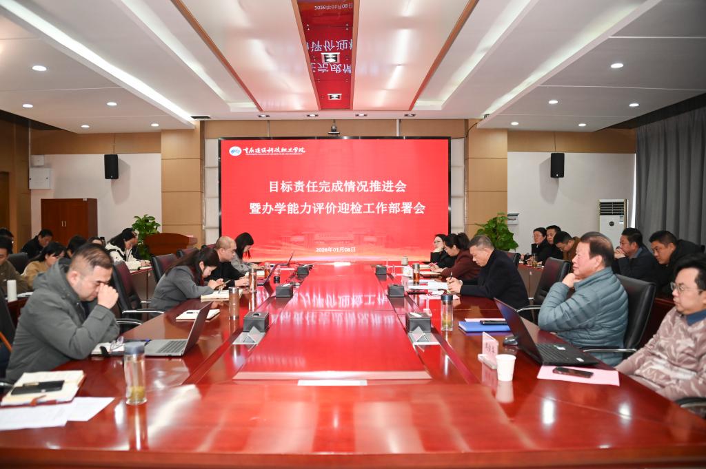 为全面梳理2025-2026学年各职能部门和二级学院的目标责任完成情况,统筹推进办学能力评价迎检各项准备工作,1月8日上午,学校在立德楼六楼会议室召开目标责任完成情况推进会暨办学能力评价迎检工作部署会。学校校长张进,副校长王靖、周俊华,校长助理周旖等校领导出席会议,相关职能部门领导、各二级学院院长及书记参加会议。会议由何培斌副校长主持。