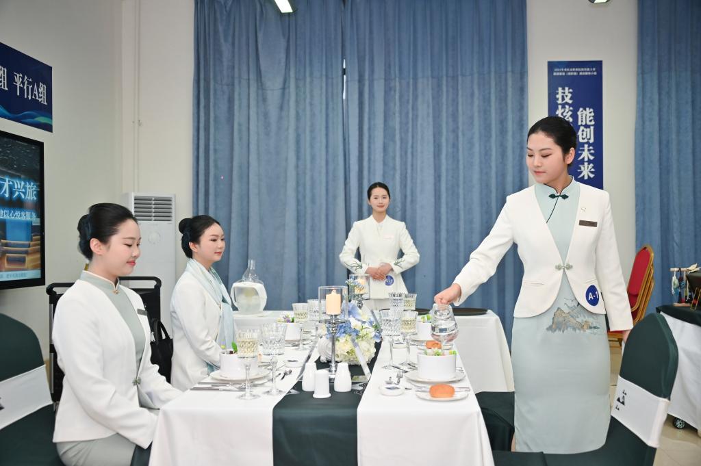 比赛中,各参赛队伍表现出良好的精神风貌与扎实的专业功底。选手们在一小时的赛程内,依据“三自主”原则设计并完成工作任务,在模拟真实情境中展现了熟练的技能与灵活的应变能力,充分彰显了酒店行业从业者的专业风采。