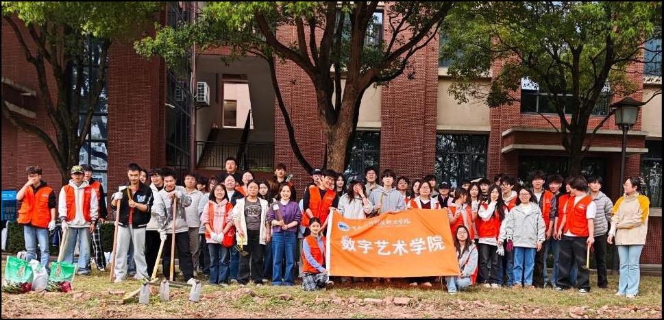 活动尾声,师生共同整理工具、清扫现场,严格做到工完场清,随后手持院旗在田垄旁合影,笑脸与新栽幼苗相映成趣。本次活动,数字艺术学院学子们以实际行动诠释了“知行合一”的实践精神,充分展现出新时代青年积极向上、乐于奉献、勇于实践的青春风貌。