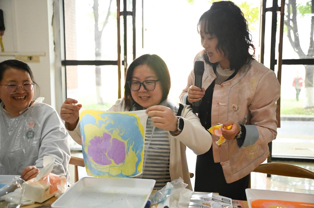 参与活动的女教职工们兴致盎然、各展巧思,大家围坐在一起,沉浸式投入手工创作。在手绢水拓画环节,大家轻滴颜料、缓缓拓印,让色彩在绢布上自然晕染,每一块手绢都化作独一无二的艺术作品,尽显灵动之美;在十字绣环节,大家穿针引线、细心勾勒,一针一线间凝聚匠心,绣出精致纹样,尽显温婉才情。大家相互交流技巧、分享创作心得,欢声笑语萦绕全场,在慢节奏的手作时光里卸下工作疲惫,尽享手工乐趣。