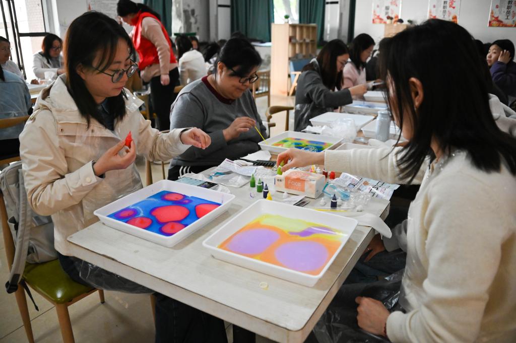 活动现场氛围温馨雅致、暖意融融,工作人员提前备好手绢、水拓画颜料、针、线、绣绷等各类手工物料,全程为大家提供细致贴心的指导服务。相较于复杂的扎染技艺,本次选取的手绢水拓画与十字绣两项手工艺,兼具趣味性与实操性,更贴合女教职工的创作需求,上手轻松、体验感十足。