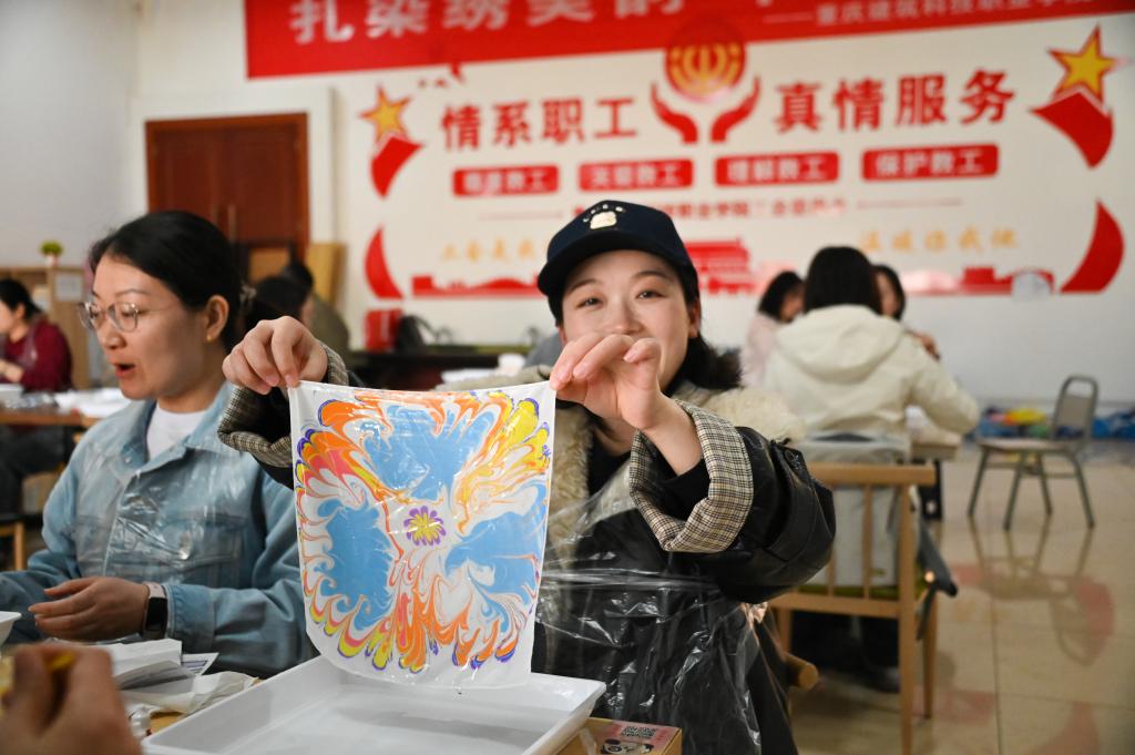 为丰富学校女教职工精神文化生活,传承中华传统手工艺文化,充分展现女教职工心灵手巧、温婉雅致的别样风采,切实传递学校与工会的暖心关怀,2026年3月11日,学校工会联合校团委,在教工之家精心开展“扎染绣美韵,巾帼绽芳华”手绢水拓画与十字绣手工艺体验活动,让全体参与女教职工在动手创作中放松身心、感受温情,彰显校工会“以人为本、关爱女职工”的工作理念。