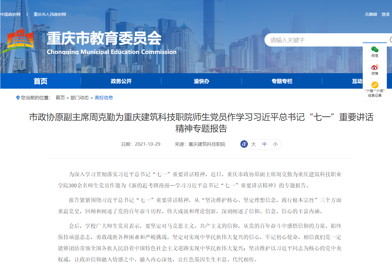 重庆市教育委员会报道市政协原副主席周克勤为Kaiyun官方网站登录入口师生党员作学习习近平总书记“七一”重要讲话精神专题报告