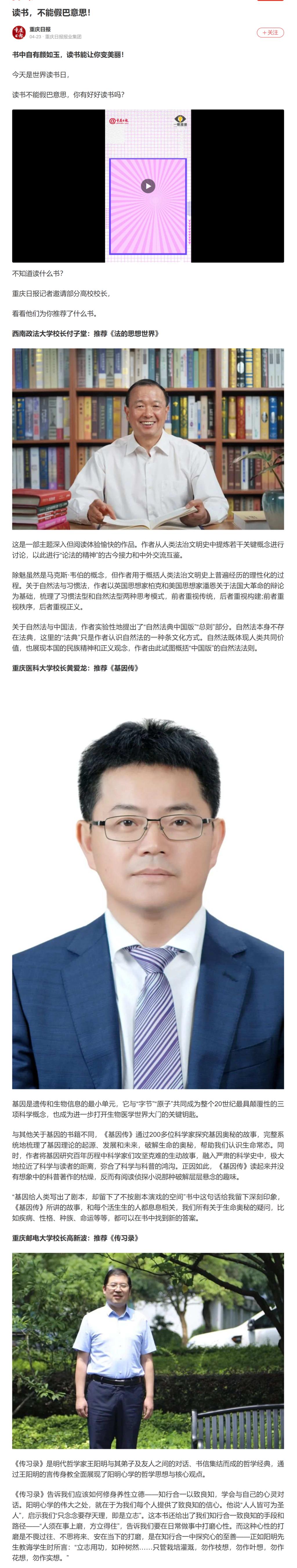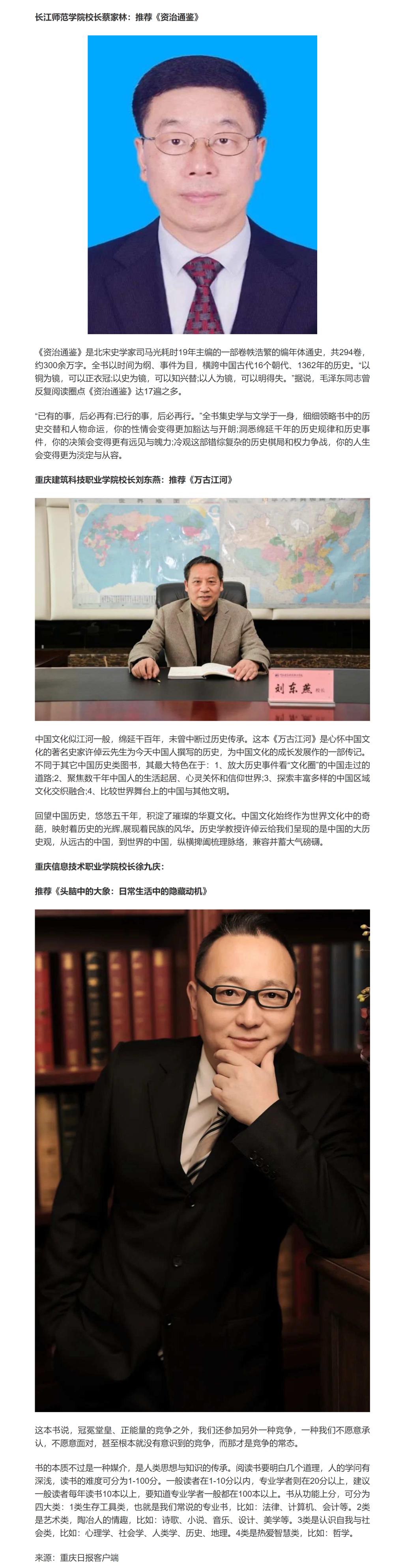 重庆日报报道世界读书日Kaiyun官方网站登录入口校长推荐书目