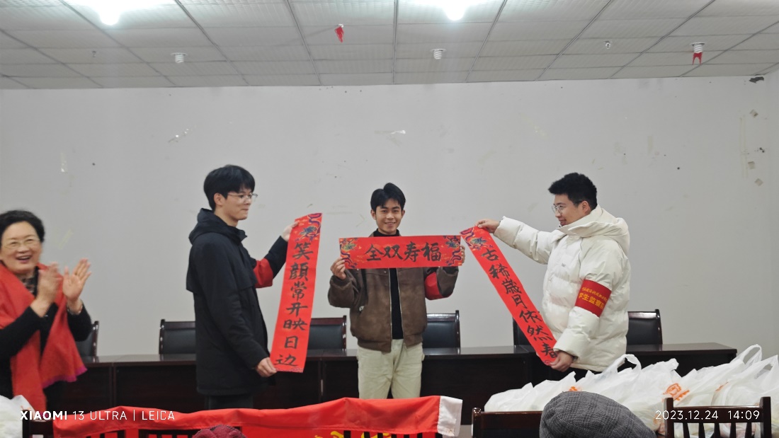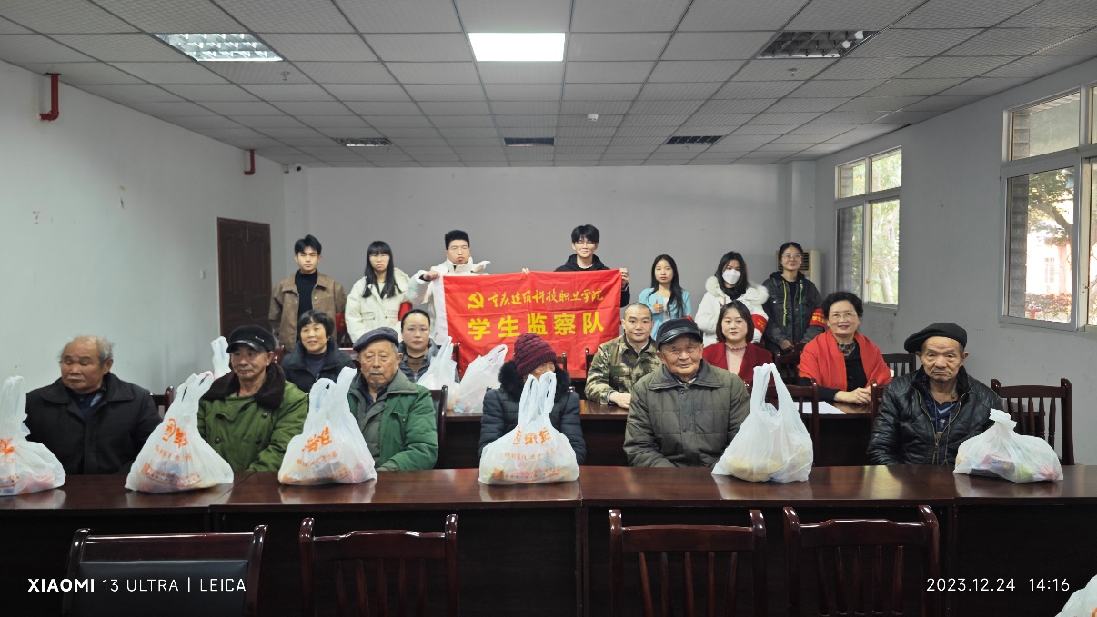 2023年12月24日下午,在辞旧迎新之际,学校纪检监察室张意老师、基础教学部陈晓辉老师带领第八届学生监察队学生代表,赴重庆高新区香炉山街道敬老院开展了献爱心慰问活动,老师和同学们与敬老院的爷爷、奶奶们亲切交谈,为爷爷、奶奶送去温暖和关爱。