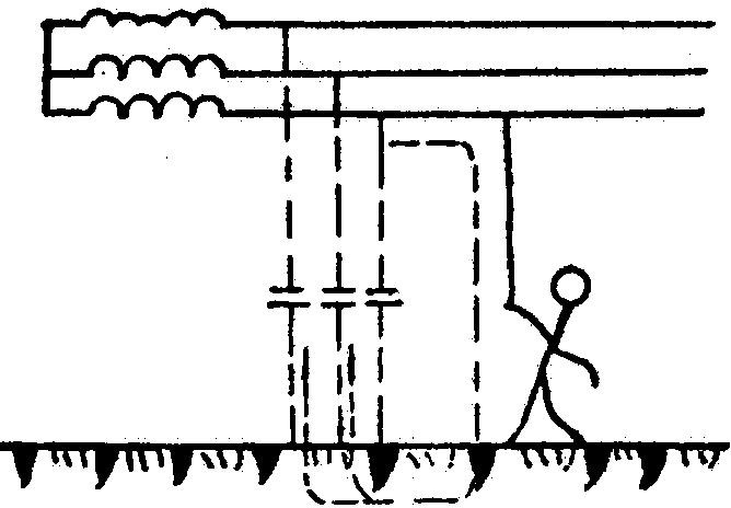 图 2-1 中性点接地系统的单线触电 图 2-2 中性点不接地系统的单线触电