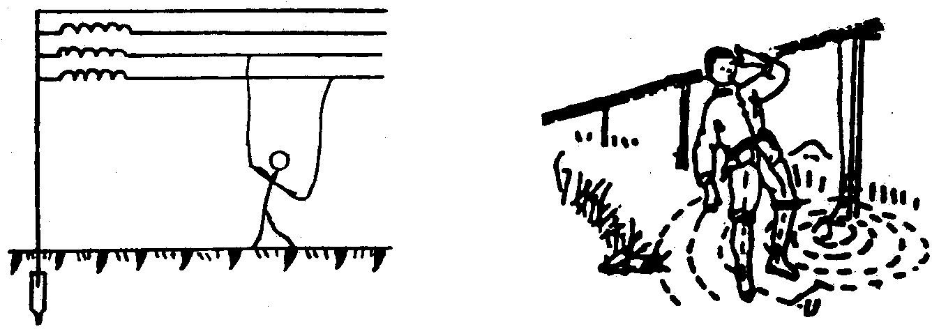 如图 2-4 所示,当人体在具有电位分布的区域内行走时, 人的两脚(一般相距以 0.8m 计算)分别处于不同电位点,使两脚间承受电位差的作用,这一电压称为跨步电压。跨步电压的大小与电位分布区域内的位置有关,在越靠近接地体处,