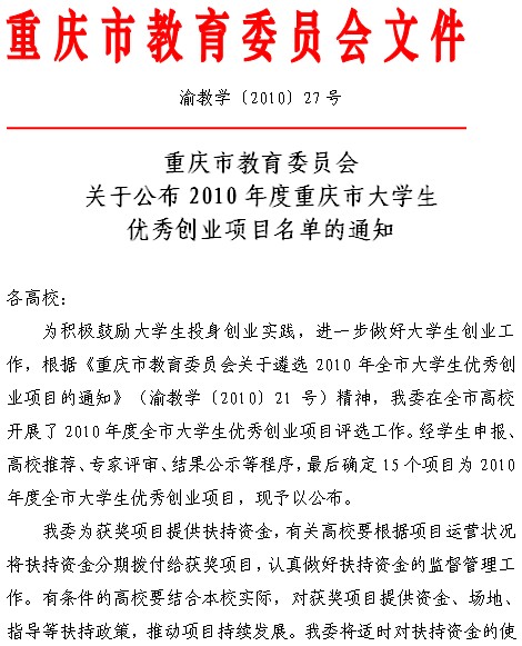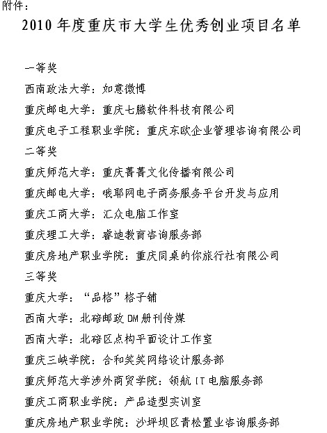 重庆市教育委员会关于公布2010年度重庆市大学生优秀创业项目名单的通知[03-10]