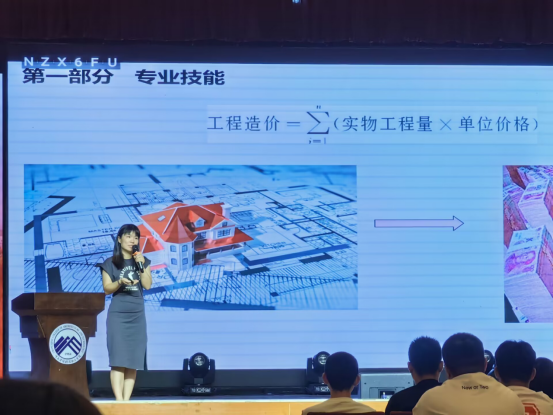 在主持人杨祎老师简短而新颖的开场白后同学们的积极性被快速地调动了起来。曾康燕老师作为工程造价专业的教师代表以专科学生所处的学制现状、专科学生的优势为引入点,让同学们对自己的未来充满希望;接着她从工程造价专业的专业技能、知识体系、培养方案、岗位工作四个方面进行了一系列的解说,让同学对所学专业有所了解,对自己未来的学习方向和今后的发展方向有了比较清晰的认识,也再次明确了作为专科学生,必须掌握过硬的专业知识,提升自我实践能力。曾老师幽默的语言和生动的讲解,极大地调动了同学们的积极性,现场气氛反应热烈。