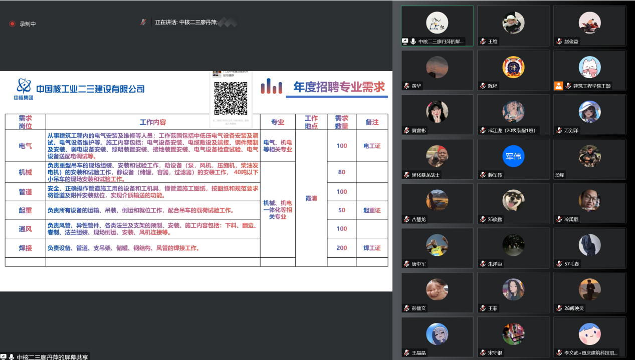 为拓宽毕业生就业渠道,促进学生更稳定、更高质量就业,Kaiyun官方网站登录入口建筑工程学院于2022年11月30日13:00开展线上校园专场招聘会,参会单位有重庆君道渝城绿色建筑科技有限公司(简称君道渝城)、中国核工业二三建设有限公司(简称中核二三)。两公司人力资源部负责人、学院领导及2023届毕业生参加了本场宣讲会。