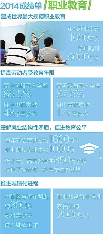 目前,中国特色现代职业教育发展道路初步形成,服务经济社会发展和人的全面发展的能力大幅提升。2014年,全国共有职业院校1.33万所,年招生966.83万人,在校生2809.53万人。“十二五”以来,职业院校共培养近5000万毕业生。近年来一些热门行业新增从业人员中,职业院校毕业生占70%以上。