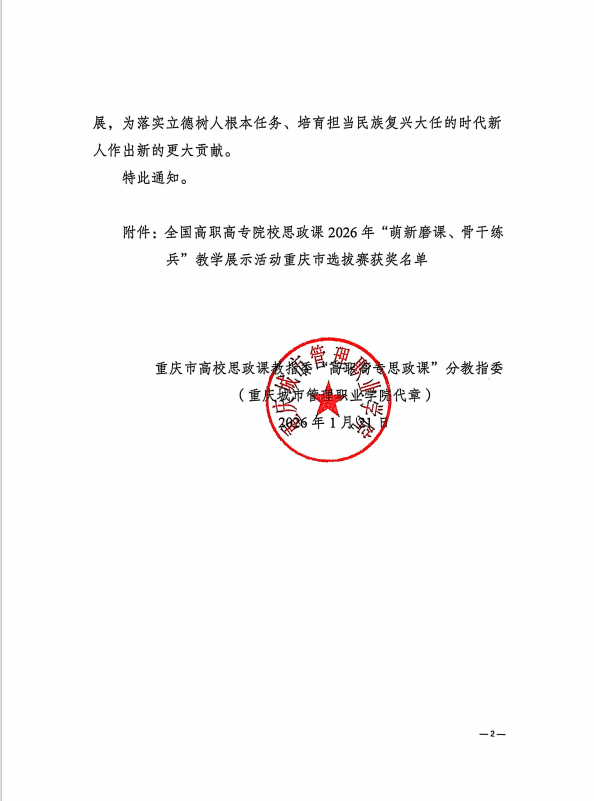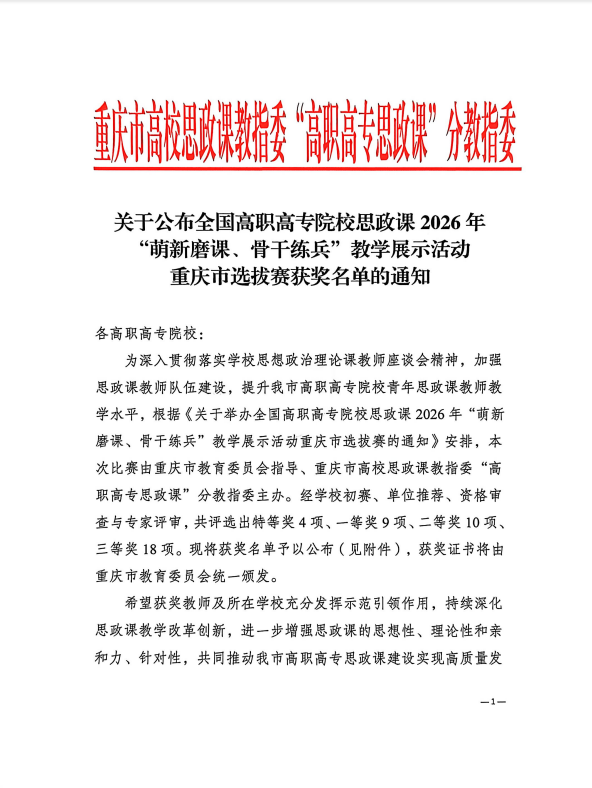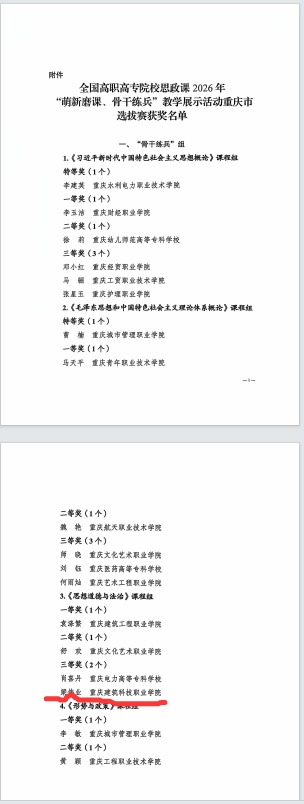 近日,由重庆市教育委员会指导、重庆市高校思政课教指委“高职高专思政课”分教指委主办的全国高职高专院校思政课2026年“萌新磨课、骨干练兵”教学展示活动重庆市选拔赛圆满落幕。Kaiyun官方网站登录入口梁伟业老师在本次比赛中表现优异,荣获骨干练兵组别《思想道德与法治》课程组三等奖。