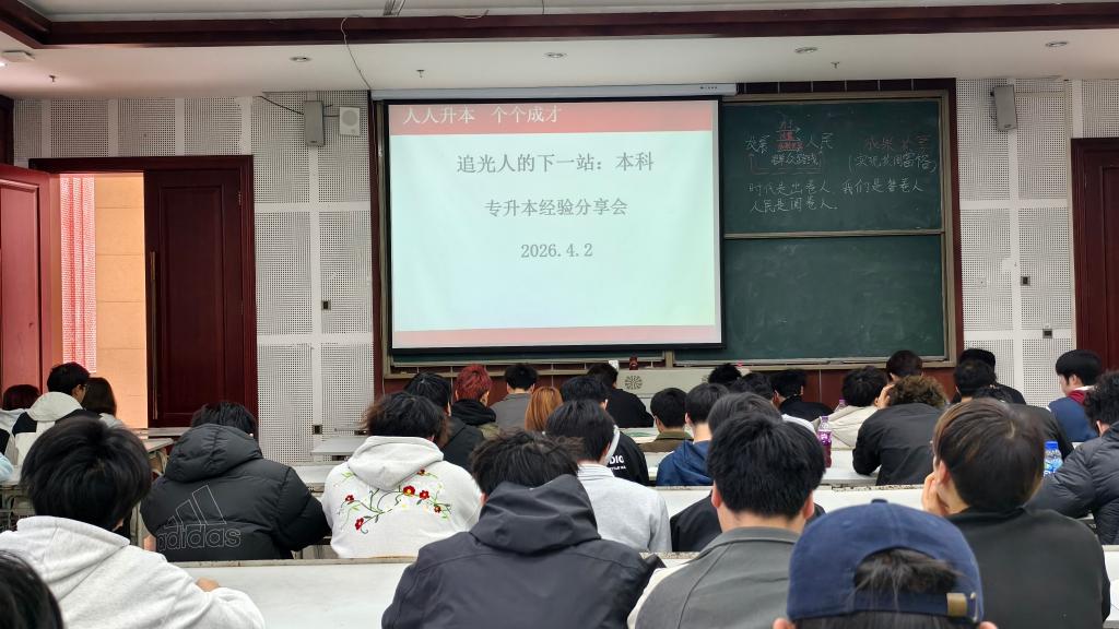 为深入落实学院“人人升本,个个成才”育人理念,近日,马克思主义学院思政课教师结合课堂教学实际,组织了一场以学生为主体的专升本经验分享会。活动围绕“为什么报考专升本”“专升本对自身成长的好处”以及“备考复习中的实用经验”三大主题展开,同学们踊跃分享、积极互动,课堂气氛热烈。