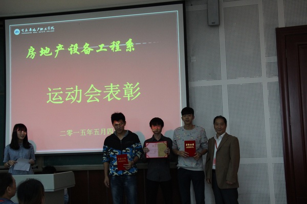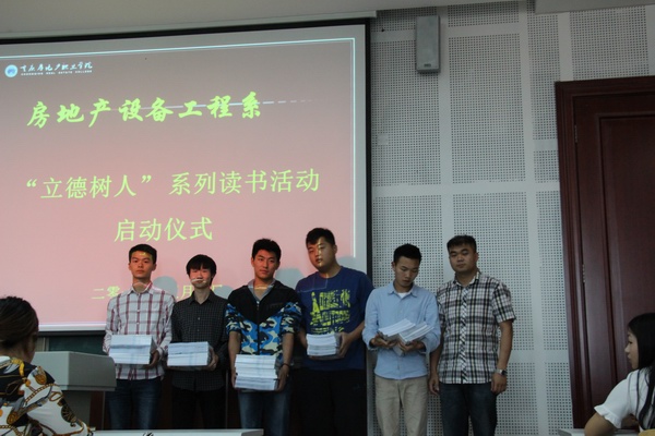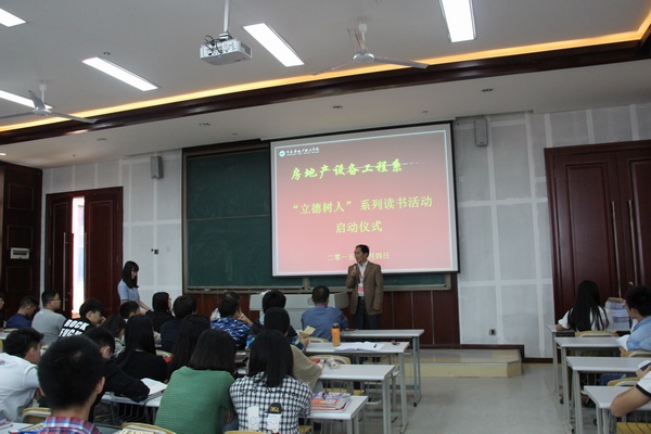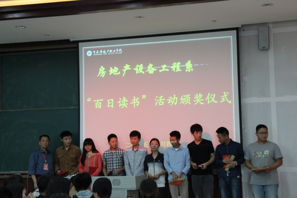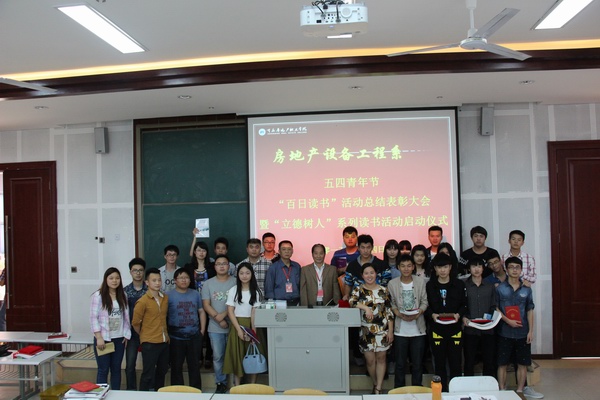 2015年5月4日,重庆房地产设备工程系在系馆楼2405召开了五四青年节“百日读书”活动总结表彰大会暨“立德树人”系列读书活动启动仪式,参加启动仪式的有伍国福主任、郝旭书记、高云副书记、刘清秀老师、李玲老师以及2014级全体学生和2013级学生干部。