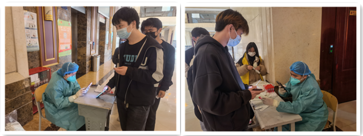 辅导员罗秋芳、樊小龙在核酸检测点负责扫码