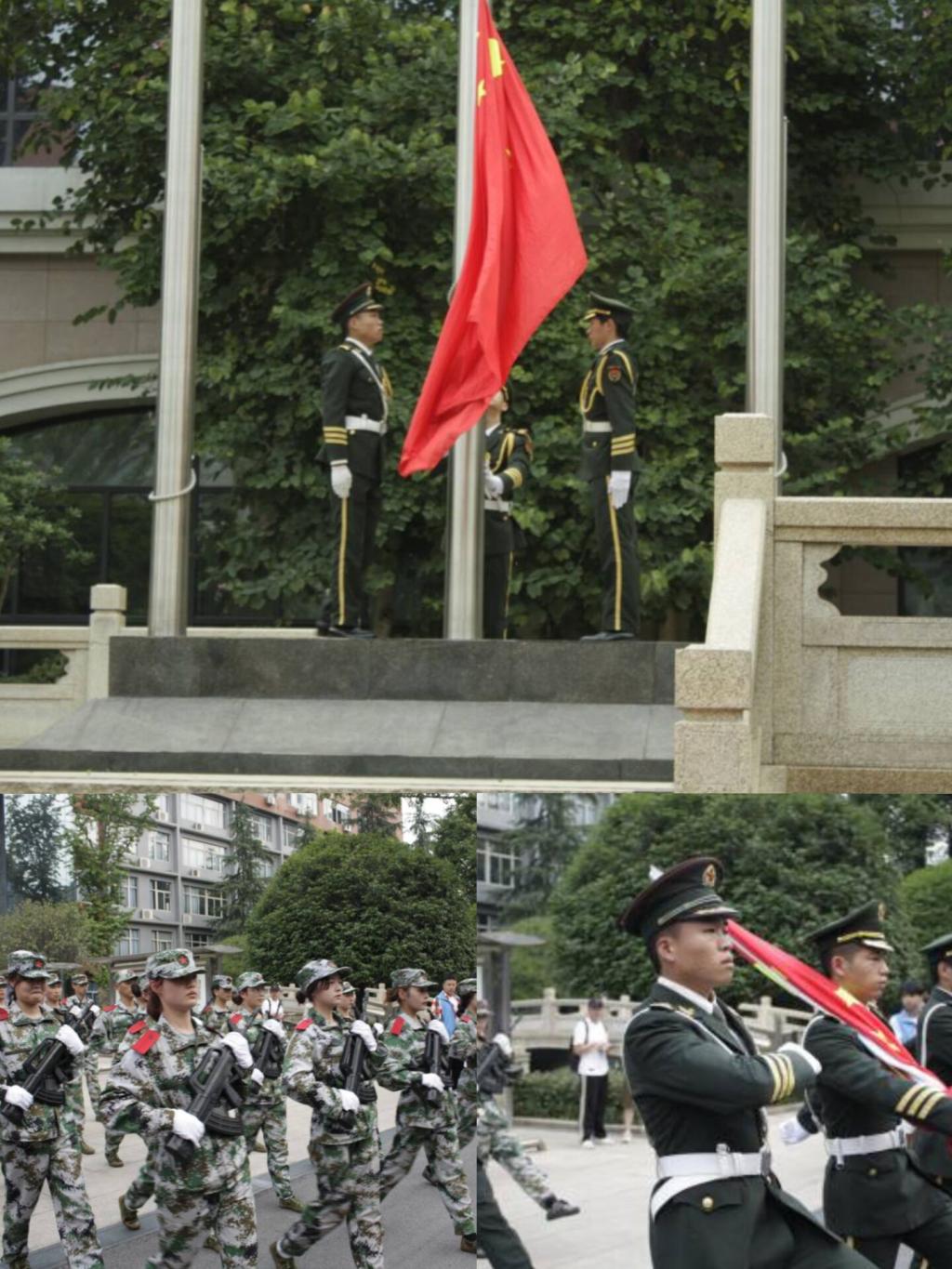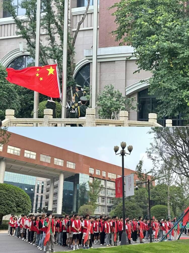 伴随着国旗护卫队铿锵有力的步伐,升旗仪式拉开序幕。国旗护卫队队员们昂首阔步,意气风发,以饱满的精神状态走向升旗台。笔挺的军姿,有力的摆臂,坚定的脚步,展现出新时代新青年昂扬的风采。国歌奏响,鲜艳的五星红旗,迎着初升的朝阳冉冉升起,迎风飘扬。现场全体人员庄严肃立,面向国旗行注目礼,高唱国歌。